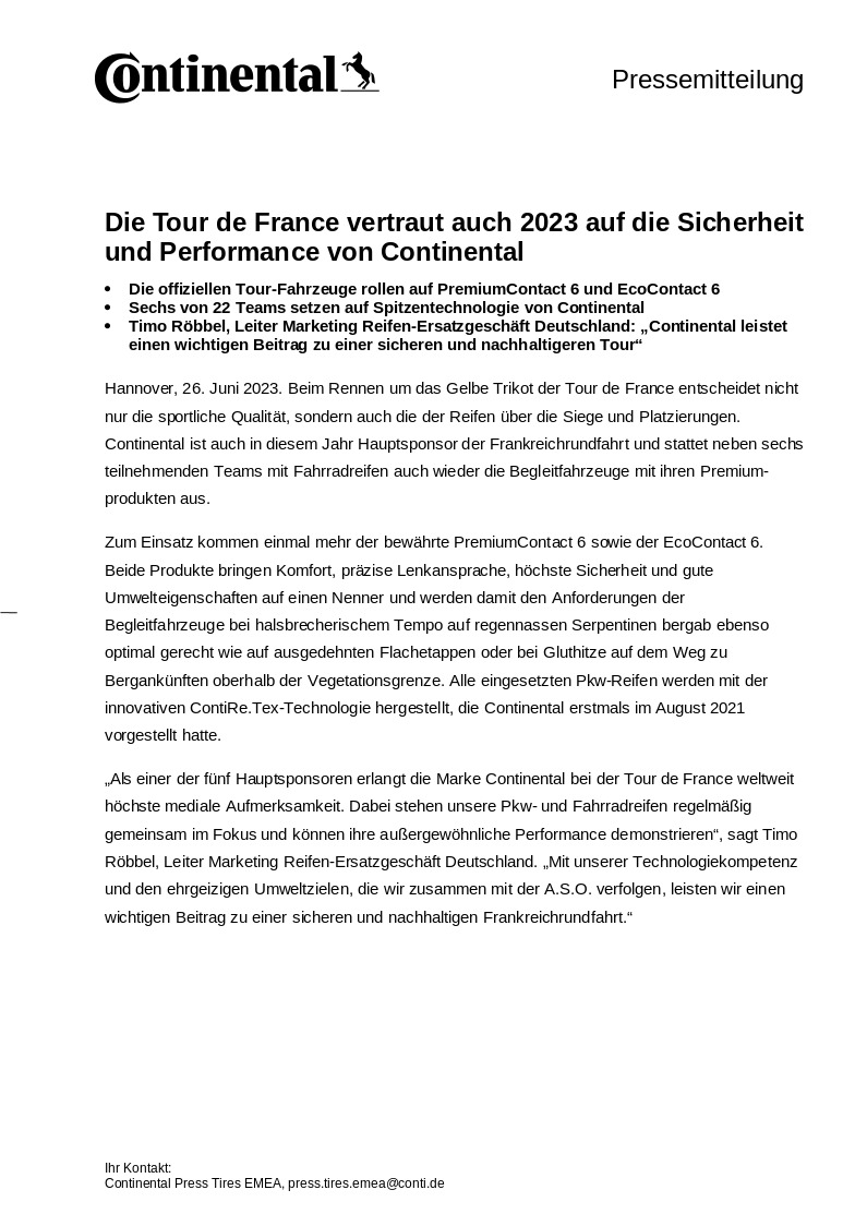 Hannover, 26. Juni 2023. Beim Rennen um das Gelbe Trikot der Tour de France entscheidet nicht nur die sportliche Qualität, sondern auch die der Reifen über die Siege und Platzierungen. Continental ist auch in diesem Jahr Hauptsponsor der Frankreichrundfahrt und stattet neben sechs teilnehmenden Teams mit Fahrradreifen auch wieder die Begleitfahrzeuge mit ihren Premium-produkten aus.