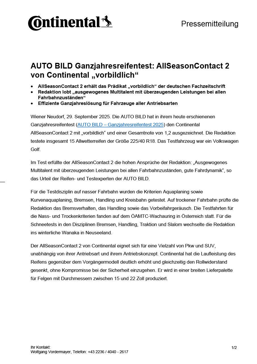 Wiener Neudorf, 29. September 2025. Die AUTO BILD hat in ihrem heute erschienenen Ganzjahresreifentest (AUTO BILD – Ganzjahresreifentest 2025) den Continental