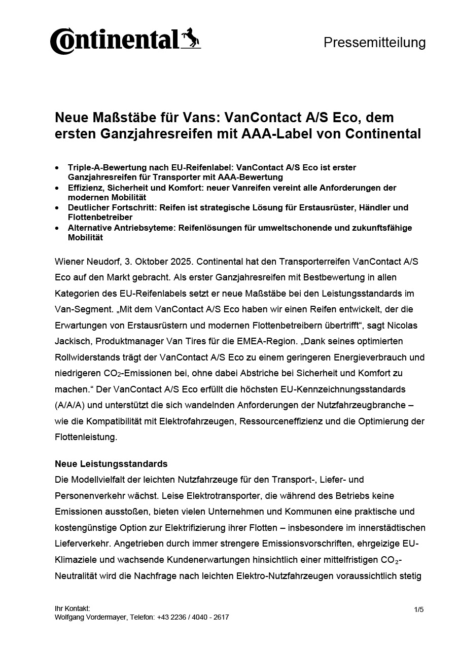 Wiener Neudorf, 3. Oktober 2025. Continental hat den Transporterreifen VanContact A/S Eco auf den Markt gebracht. Als erster Ganzjahresreifen mit Bestbewertung in allen Kategorien des EU-Reifenlabels setzt er neue Maßstäbe bei den Leistungsstandards im Van-Segment. „Mit dem VanContact A/S Eco haben wir einen Reifen entwickelt, der die Erwartungen von Erstausrüstern und modernen Flottenbetreibern übertrifft“, sagt Nicolas Jackisch, Produktmanager Van Tires für die EMEA-Region. „Dank seines optimierten Rollwiderstands trägt der VanContact A/S Eco zu einem geringeren Energieverbrauch und niedrigeren CO2-Emissionen bei, ohne dabei Abstriche bei Sicherheit und Komfort zu machen.“ Der VanContact A/S Eco erfüllt die höchsten EU-Kennzeichnungsstandards (A/A/A) und unterstützt die sich wandelnden Anforderungen der Nutzfahrzeugbranche – wie die Kompatibilität mit Elektrofahrzeugen, Ressourceneffizienz und die Optimierung der Flottenleistung.