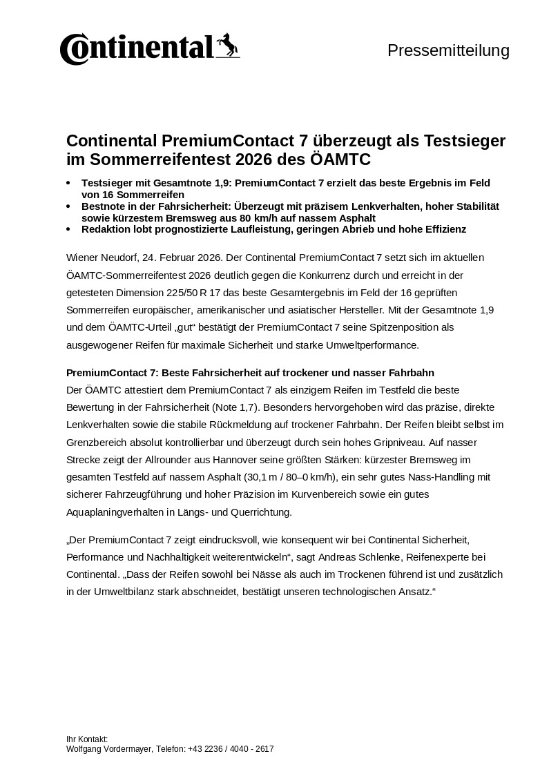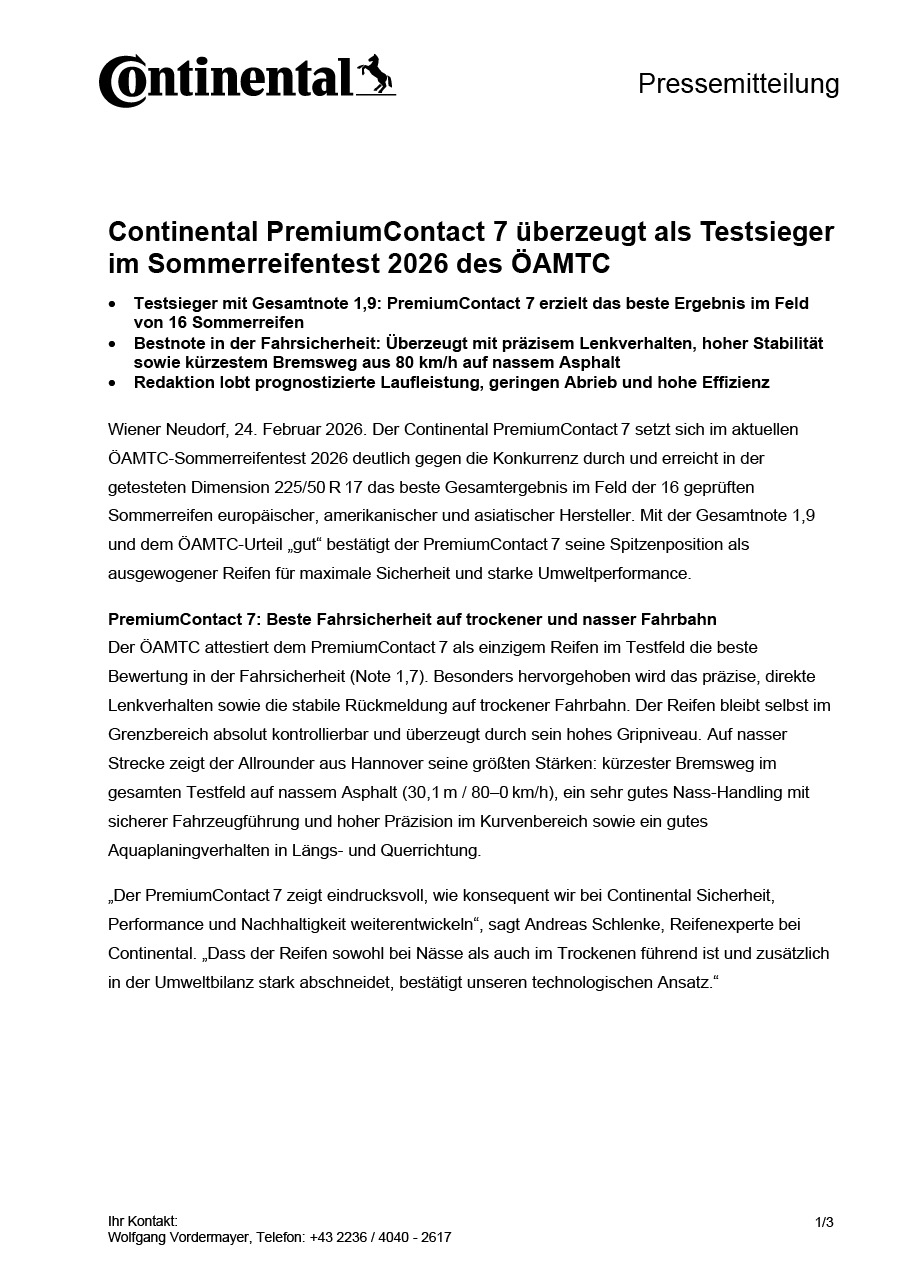 Wiener Neudorf, 24. Februar 2026. Der Continental PremiumContact 7 setzt sich im aktuellen ÖAMTC‑Sommerreifentest 2026 deutlich gegen die Konkurrenz durch und erreicht in der getesteten Dimension 225/50 R 17 das beste Gesamtergebnis im Feld der 16 geprüften Sommerreifen europäischer, amerikanischer und asiatischer Hersteller. Mit der Gesamtnote 1,9 und dem ÖAMTC‑Urteil „gut“ bestätigt der PremiumContact 7 seine Spitzenposition als ausgewogener Reifen für maximale Sicherheit und starke Umweltperformance.