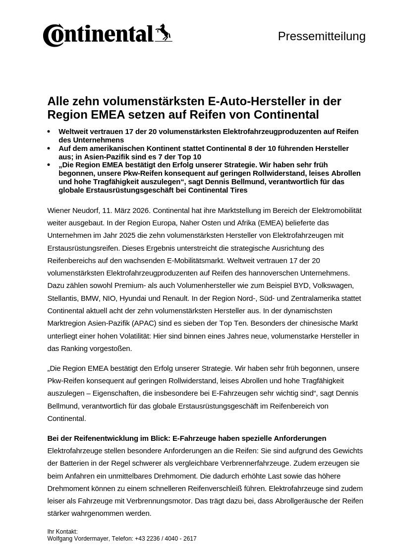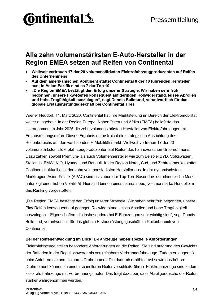 Wiener Neudorf, 11. März 2026. Continental hat ihre Marktstellung im Bereich der Elektromobilität weiter ausgebaut. In der Region Europa, Naher Osten und Afrika (EMEA) belieferte das Unternehmen im Jahr 2025 die zehn volumenstärksten Hersteller von Elektrofahrzeugen mit Erstausrüstungsreifen. Dieses Ergebnis unterstreicht die strategische Ausrichtung des Reifenbereichs auf den wachsenden E-Mobilitätsmarkt. Weltweit vertrauen 17 der 20 volumenstärksten Elektrofahrzeugproduzenten auf Reifen des hannoverschen Unternehmens. Dazu zählen sowohl Premium- als auch Volumenhersteller wie zum Beispiel BYD, Volkswagen, Stellantis, BMW, NIO, Hyundai und Renault. In der Region Nord-, Süd- und Zentralamerika stattet Continental aktuell acht der zehn volumenstärksten Hersteller aus. In der dynamischsten Marktregion Asien-Pazifik (APAC) sind es sieben der Top Ten. Besonders der chinesische Markt unterliegt einer hohen Volatilität: Hier sind binnen eines Jahres neue, volumenstarke Hersteller in das Ranking vorgestoßen.