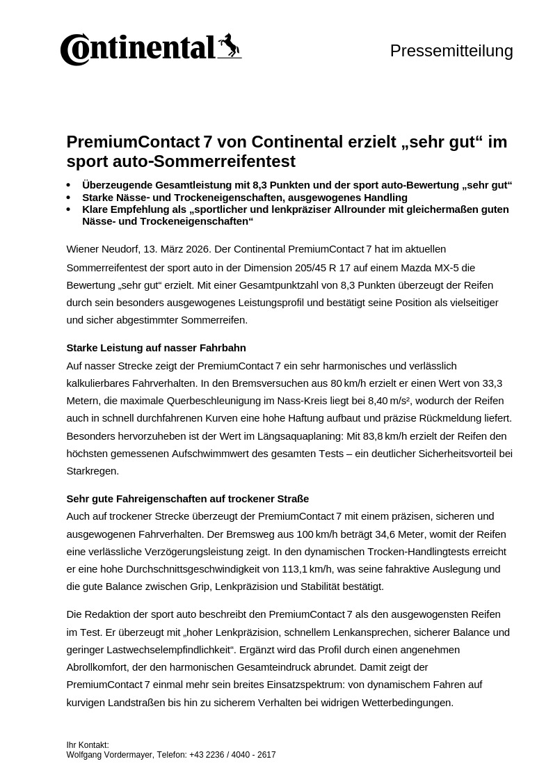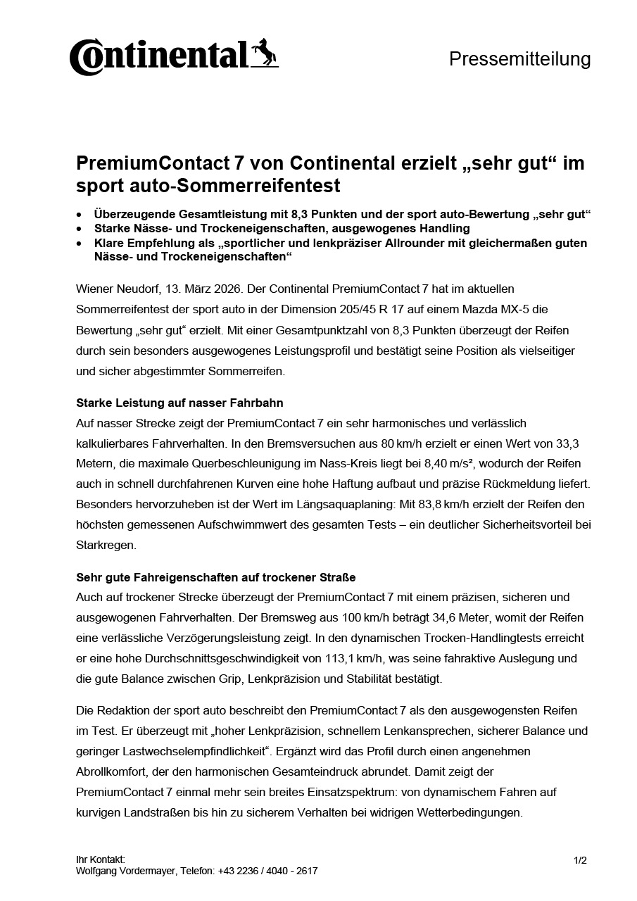 Wiener Neudorf, 13. März 2026. Der Continental PremiumContact 7 hat im aktuellen Sommerreifentest der sport auto in der Dimension 205/45 R 17 auf einem Mazda MX‑5 die Bewertung „sehr gut“ erzielt. Mit einer Gesamtpunktzahl von 8,3 Punkten überzeugt der Reifen durch sein besonders ausgewogenes Leistungsprofil und bestätigt seine Position als vielseitiger und sicher abgestimmter Sommerreifen.