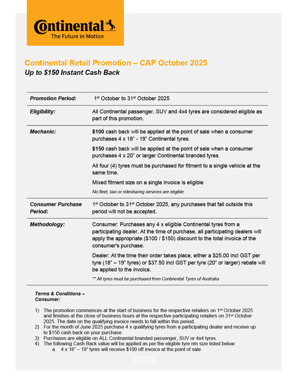 - A $100 cash back will be applied at the point of sale when a consumer purchases a set of four (4) Continental tyres 18” - 19".