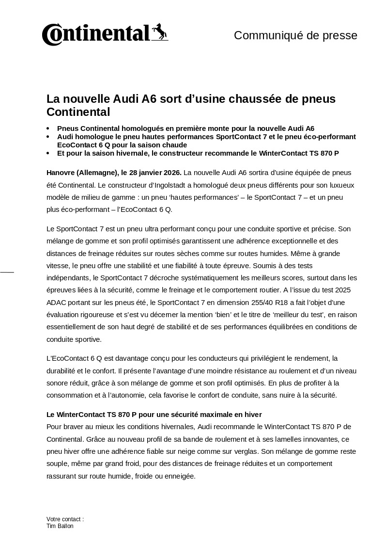 Hanovre (Allemagne), le 28 janvier 2026. La nouvelle Audi A6 sortira d’usine équipée de pneus été Continental. Le constructeur d’Ingolstadt a homologué deux pneus différents pour son luxueux modèle de milieu de gamme : un pneu ‘hautes performances’ – le SportContact 7 – et un pneu plus éco-performant – l’EcoContact 6 Q.