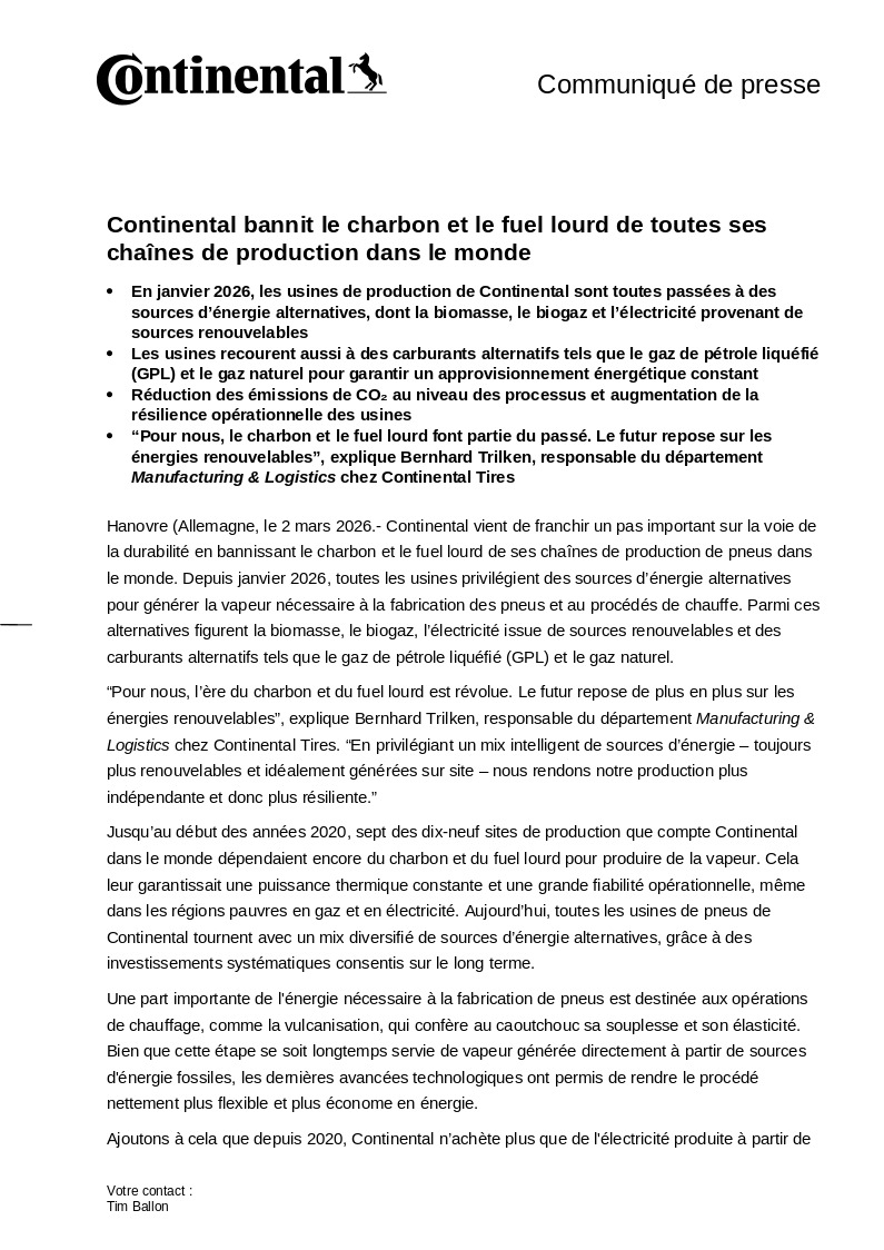 Hanovre (Allemagne, le 2 mars 2026.- Continental vient de franchir un pas important sur la voie de la durabilité en bannissant le charbon et le fuel lourd de ses chaînes de production de pneus dans le monde. Depuis janvier 2026, toutes les usines privilégient des sources d’énergie alternatives pour générer la vapeur nécessaire à la fabrication des pneus et au procédés de chauffe. Parmi ces alternatives figurent la biomasse, le biogaz, l’électricité issue de sources renouvelables et des carburants alternatifs tels que le gaz de pétrole liquéfié (GPL) et le gaz naturel.