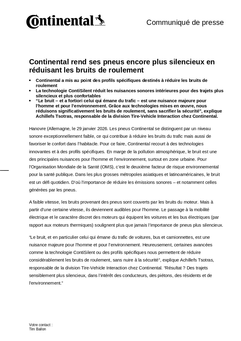 Hanovre (Allemagne, le 29 janvier 2026. Les pneus Continental se distinguent par un niveau sonore exceptionnellement faible, ce qui contribue à réduire les bruits du trafic mais aussi de favoriser le confort dans l’habitacle. Pour ce faire, Continental recourt à des technologies innovantes et à des profils spécifiques. En marge de la pollution atmosphérique, le bruit est une des principales nuisances pour l’homme et l’environnement, surtout en zone urbaine. Pour l’Organisation Mondiale de la Santé (OMS), c’est le deuxième facteur de risque environnemental pour la santé publique. Dans les plus grosses métropoles asiatiques et latinoaméricaines, le bruit est un défi quotidien. D’où l’importance de réduire les émissions sonores – et notamment celles générées par les pneus.
