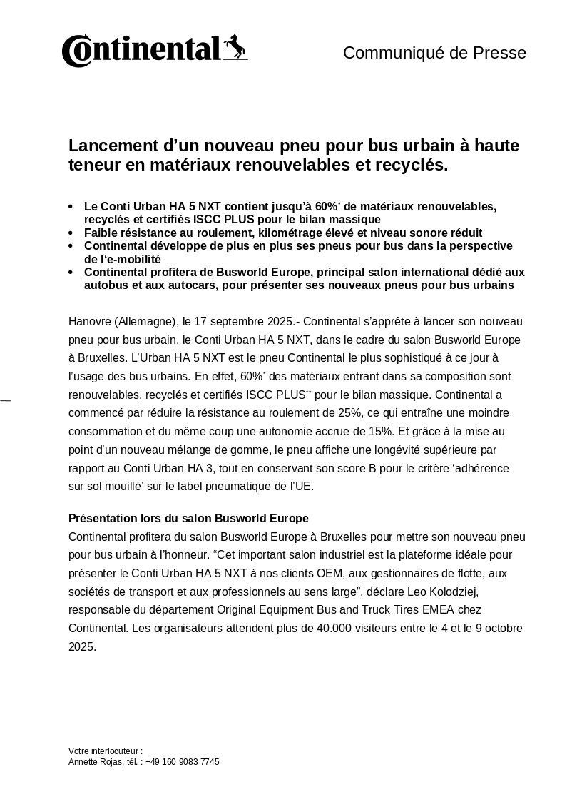 Hanovre (Allemagne), le 17 septembre 2025.- Continental s’apprête à lancer son nouveau pneu pour bus urbain, le Conti Urban HA 5 NXT, dans le cadre du salon Busworld Europe à Bruxelles. L’Urban HA 5 NXT est le pneu Continental le plus sophistiqué à ce jour à l’usage des bus urbains. En effet, 60%* des matériaux entrant dans sa composition sont renouvelables, recyclés et certifiés ISCC PLUS** pour le bilan massique. Continental a commencé par réduire la résistance au roulement de 25%, ce qui entraîne une moindre consommation et du même coup une autonomie accrue de 15%. Et grâce à la mise au point d’un nouveau mélange de gomme, le pneu affiche une longévité supérieure par rapport au Conti Urban HA 3, tout en conservant son score B pour le critère ‘adhérence sur sol mouillé’ sur le label pneumatique de l’UE.