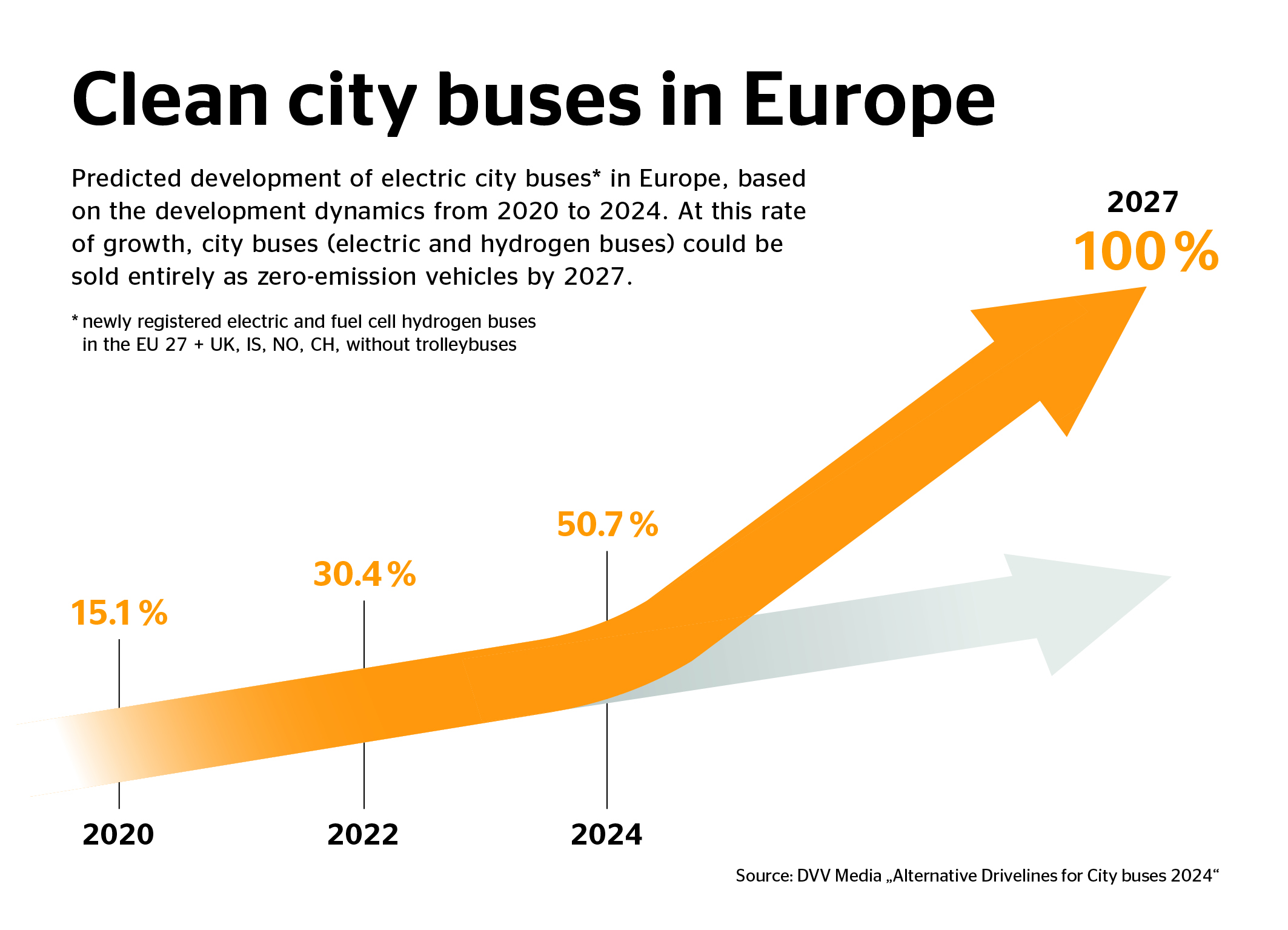 Dans son travail de développement de pneus pour bus, le fabricant allemand tient compte des mégatendances en matière d‘urbanisation et de mobilité zéro émissions. Si l’on en croit l'autorité européenne Eurostat, près de 80% des Européens résideront dans un centre urbain d'ici 2030. D'où l'importance d’adopter des solutions de transport silencieuses et à faibles d‘émissions, ainsi que des systèmes numériques de gestion du trafic. Au regard des objectifs climatiques ambitieux de l'UE et des nouvelles réglementations, cette évolution est indispensable. La Commission européenne a notamment décrété qu’à partir de 2030, seuls les bus zéro émission pourront encore être nouvellement immatriculés. En 2024, 50% de tous les bus urbains nouvellement immatriculés dans l'UE étaient déjà ‘propres’ (source : DVV Media “Alternative Drivelines for City bus 2024”). Dans certains pays, comme les Pays-Bas, le Danemark, la Slovénie, l’Irlande, la Finlande et le Portugal, leur part était déjà de 100%.