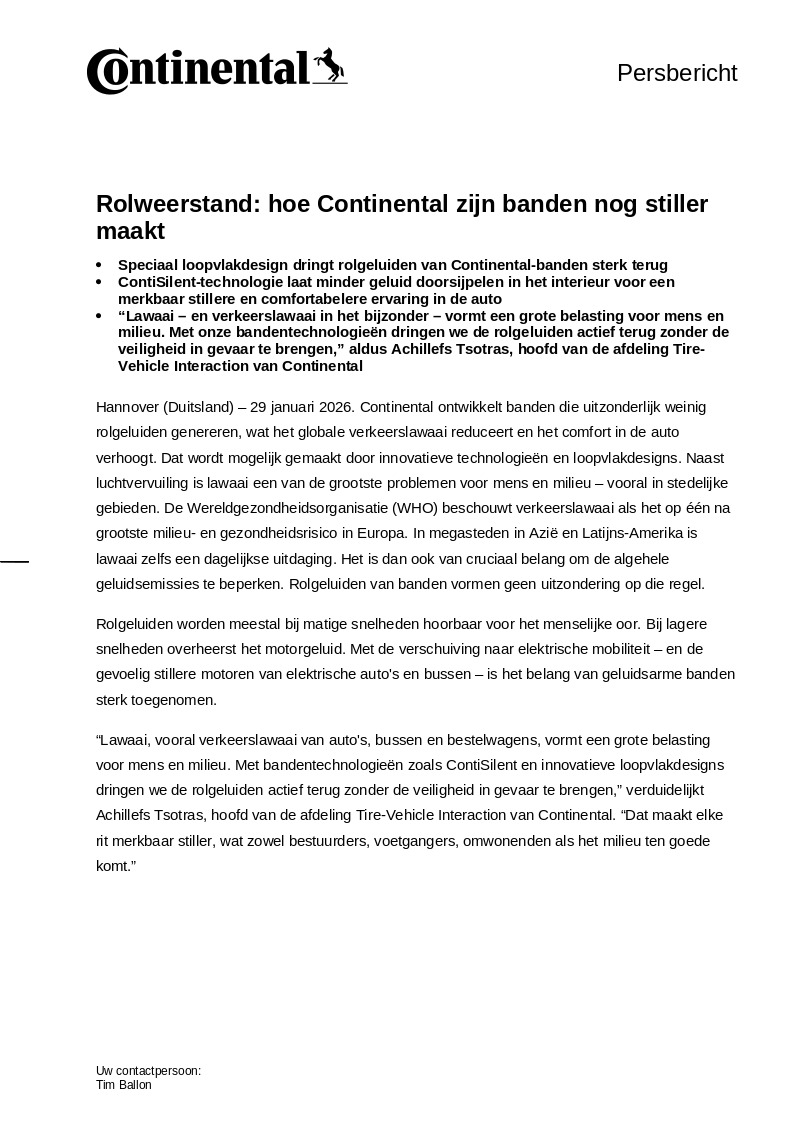 “Lawaai, vooral verkeerslawaai van auto's, bussen en bestelwagens, vormt een grote belasting voor mens en milieu. Met bandentechnologieën zoals ContiSilent en innovatieve loopvlakdesigns dringen we de rolgeluiden actief terug zonder de veiligheid in gevaar te brengen,” verduidelijkt Achillefs Tsotras, hoofd van de afdeling Tire-Vehicle Interaction van Continental. “Dat maakt elke rit merkbaar stiller, wat zowel bestuurders, voetgangers, omwonenden als het milieu ten goede komt.”