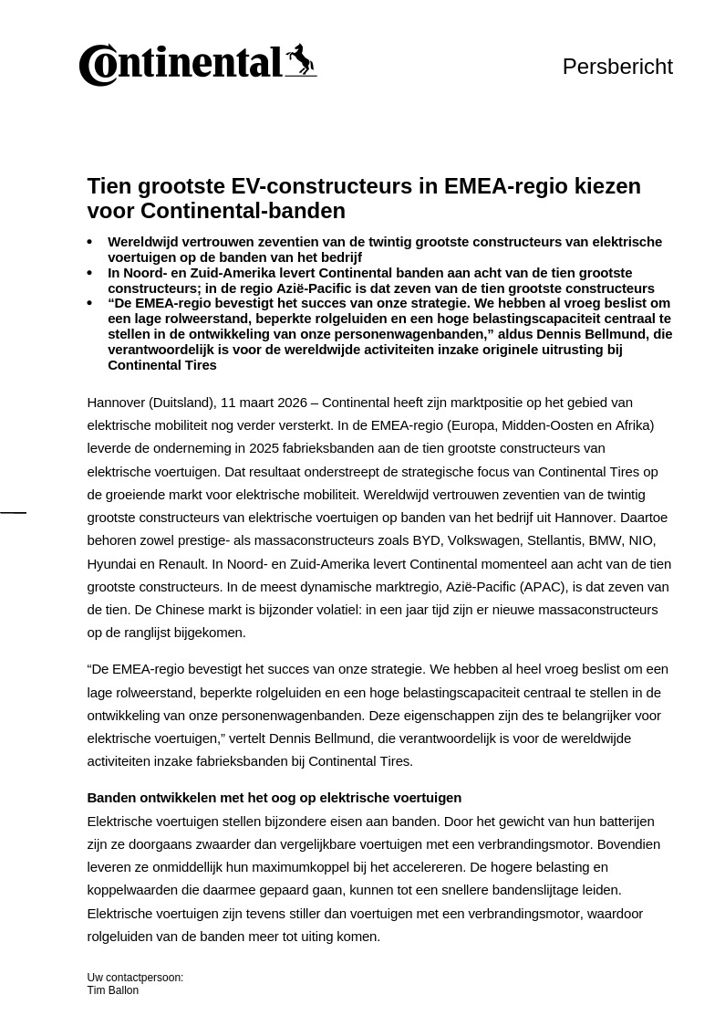 Hannover (Duitsland), 11 maart 2026 – Continental heeft zijn marktpositie op het gebied van elektrische mobiliteit nog verder versterkt. In de EMEA-regio (Europa, Midden-Oosten en Afrika) leverde de onderneming in 2025 fabrieksbanden aan de tien grootste constructeurs van elektrische voertuigen. Dat resultaat onderstreept de strategische focus van Continental Tires op de groeiende markt voor elektrische mobiliteit. Wereldwijd vertrouwen zeventien van de twintig grootste constructeurs van elektrische voertuigen op banden van het bedrijf uit Hannover. Daartoe behoren zowel prestige- als massaconstructeurs zoals BYD, Volkswagen, Stellantis, BMW, NIO, Hyundai en Renault. In Noord- en Zuid-Amerika levert Continental momenteel aan acht van de tien grootste constructeurs. In de meest dynamische marktregio, Azië-Pacific (APAC), is dat zeven van de tien. De Chinese markt is bijzonder volatiel: in een jaar tijd zijn er nieuwe massaconstructeurs op de ranglijst bijgekomen.