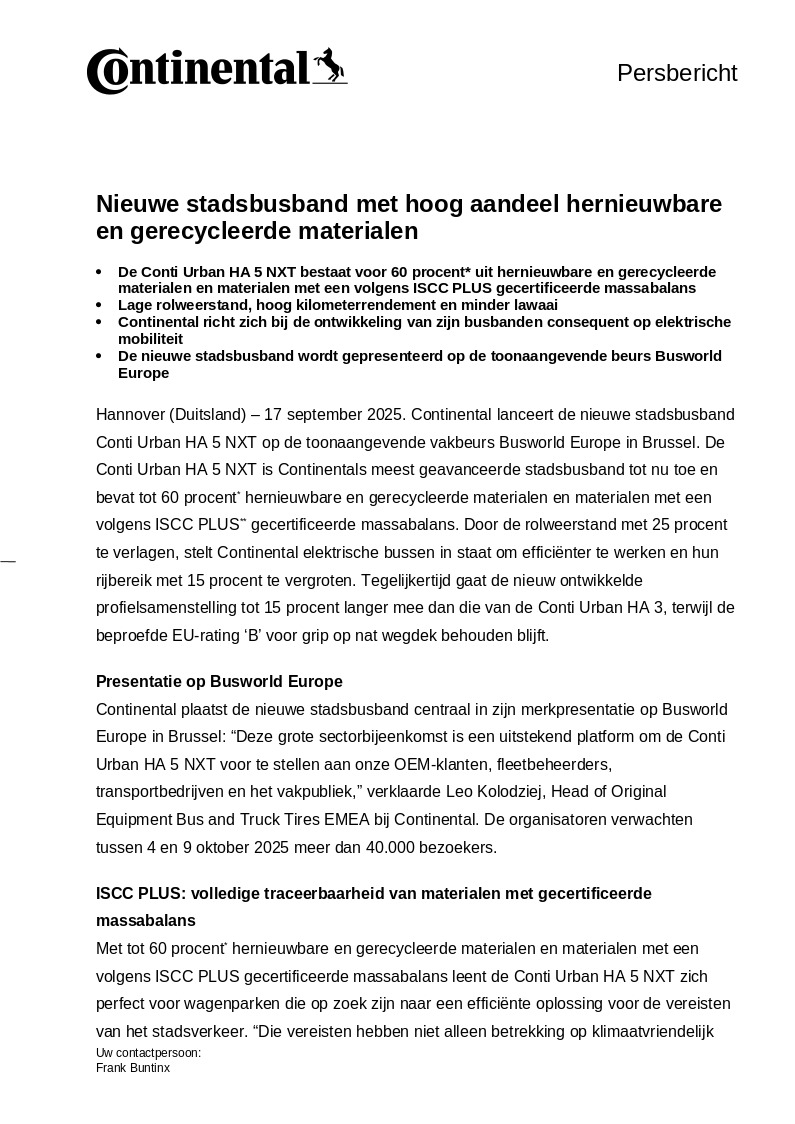 Continental plaatst de nieuwe stadsbusband centraal in zijn merkpresentatie op Busworld Europe in Brussel: “Deze grote sectorbijeenkomst is een uitstekend platform om de Conti Urban HA 5 NXT voor te stellen aan onze OEM-klanten, fleetbeheerders, transportbedrijven en het vakpubliek,” verklaarde Leo Kolodziej, Head of Original Equipment Bus and Truck Tires EMEA bij Continental. De organisatoren verwachten tussen 4 en 9 oktober 2025 meer dan 40.000 bezoekers.