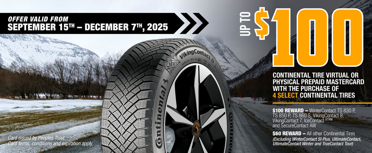 Up to $100 Continental Tire Visa* Prepaid by mail with the purchase of 4 select Continental Tires. Offer valid from September 15 to December 7, 2025.