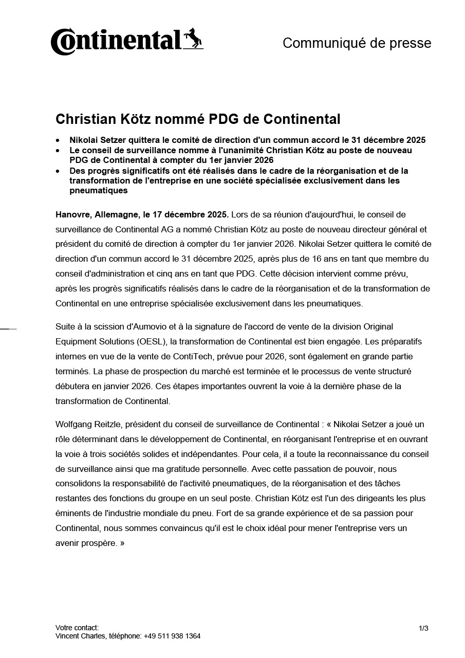 Hanovre, Allemagne, le 17 décembre 2025. Lors de sa réunion d'aujourd'hui, le conseil de surveillance de Continental AG a nommé Christian Kötz au poste de nouveau directeur général et président du comité de direction à compter du 1er janvier 2026. Nikolai Setzer quittera le comité de direction d'un commun accord le 31 décembre 2025, après plus de 16 ans en tant que membre du conseil d'administration et cinq ans en tant que PDG. Cette décision intervient comme prévu, après les progrès significatifs réalisés dans le cadre de la réorganisation et de la transformation de Continental en une entreprise spécialisée exclusivement dans les pneumatiques.