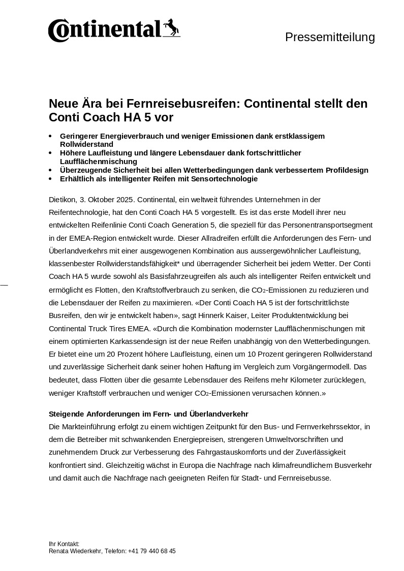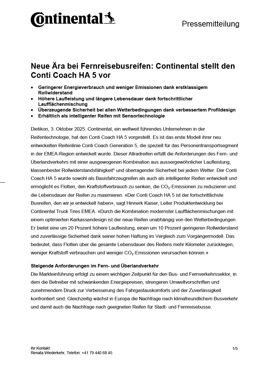Dietikon, 3. Oktober 2025. Continental, ein weltweit führendes Unternehmen in der Reifentechnologie, hat den Conti Coach HA 5 vorgestellt. Es ist das erste Modell ihrer neu entwickelten Reifenlinie Conti Coach Generation 5, die speziell für das Personentransportsegment in der EMEA-Region entwickelt wurde. Dieser Allradreifen erfüllt die Anforderungen des Fern- und Überlandverkehrs mit einer ausgewogenen Kombination aus aussergewöhnlicher Laufleistung, klassenbester Rollwiderstandsfähigkeit* und überragender Sicherheit bei jedem Wetter. Der Conti Coach HA 5 wurde sowohl als Basisfahrzeugreifen als auch als intelligenter Reifen entwickelt und ermöglicht es Flotten, den Kraftstoffverbrauch zu senken, die CO₂-Emissionen zu reduzieren und die Lebensdauer der Reifen zu maximieren. «Der Conti Coach HA 5 ist der fortschrittlichste Busreifen, den wir je entwickelt haben», sagt Hinnerk Kaiser, Leiter Produktentwicklung bei Continental Truck Tires EMEA. «Durch die Kombination modernster Laufflächenmischungen mit einem optimierten Karkassendesign ist der neue Reifen unabhängig von den Wetterbedingungen. Er bietet eine um 20 Prozent höhere Laufleistung, einen um 10 Prozent geringeren Rollwiderstand und zuverlässige Sicherheit dank seiner hohen Haftung im Vergleich zum Vorgängermodell. Das bedeutet, dass Flotten über die gesamte Lebensdauer des Reifens mehr Kilometer zurücklegen, weniger Kraftstoff verbrauchen und weniger CO₂-Emissionen verursachen können.»