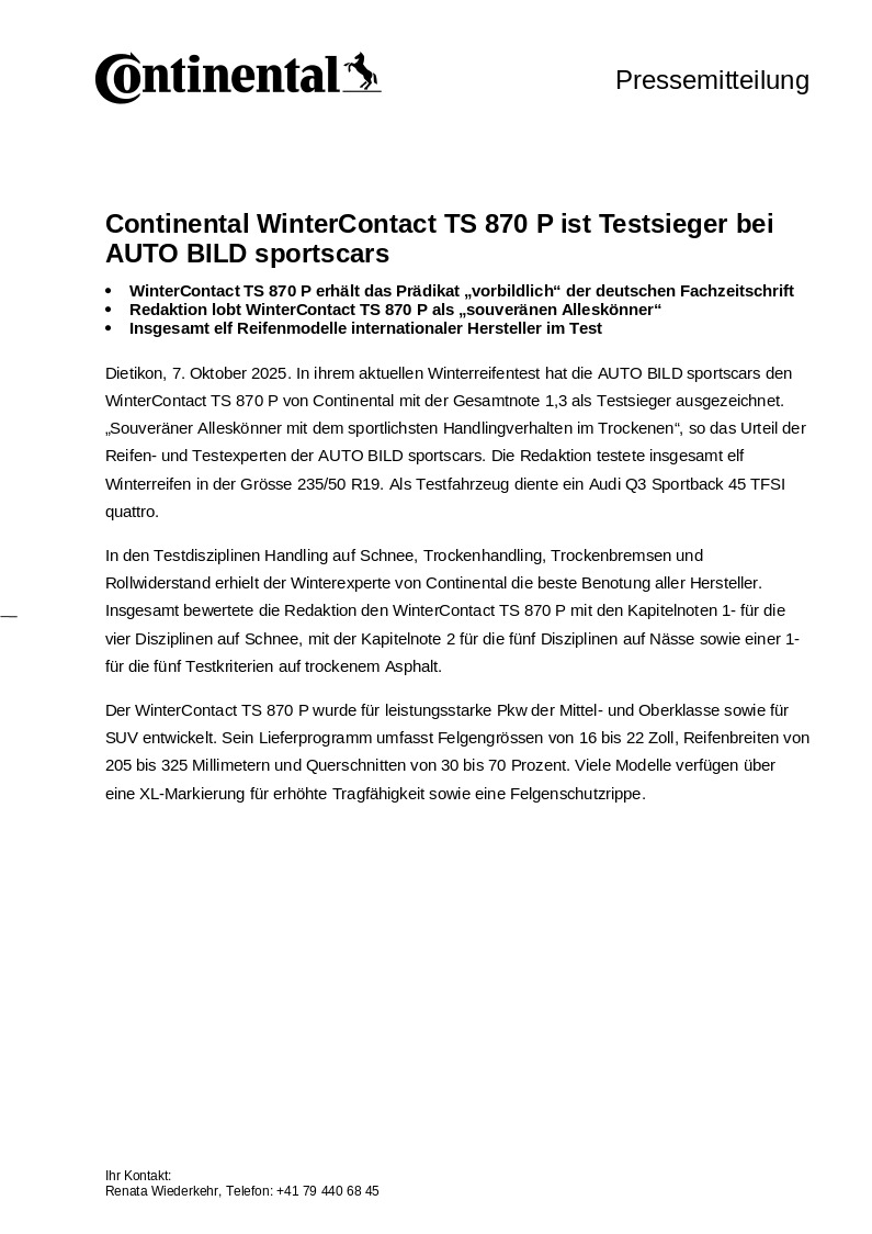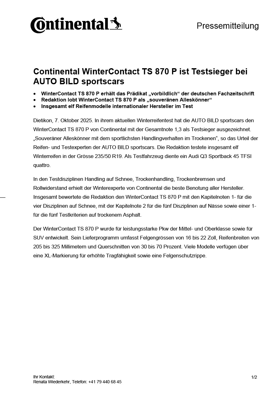 Dietikon, 7. Oktober 2025. In ihrem aktuellen Winterreifentest hat die AUTO BILD sportscars den WinterContact TS 870 P von Continental mit der Gesamtnote 1,3 als Testsieger ausgezeichnet. „Souveräner Alleskönner mit dem sportlichsten Handlingverhalten im Trockenen“, so das Urteil der Reifen- und Testexperten der AUTO BILD sportscars. Die Redaktion testete insgesamt elf Winterreifen in der Grösse 235/50 R19. Als Testfahrzeug diente ein Audi Q3 Sportback 45 TFSI quattro.