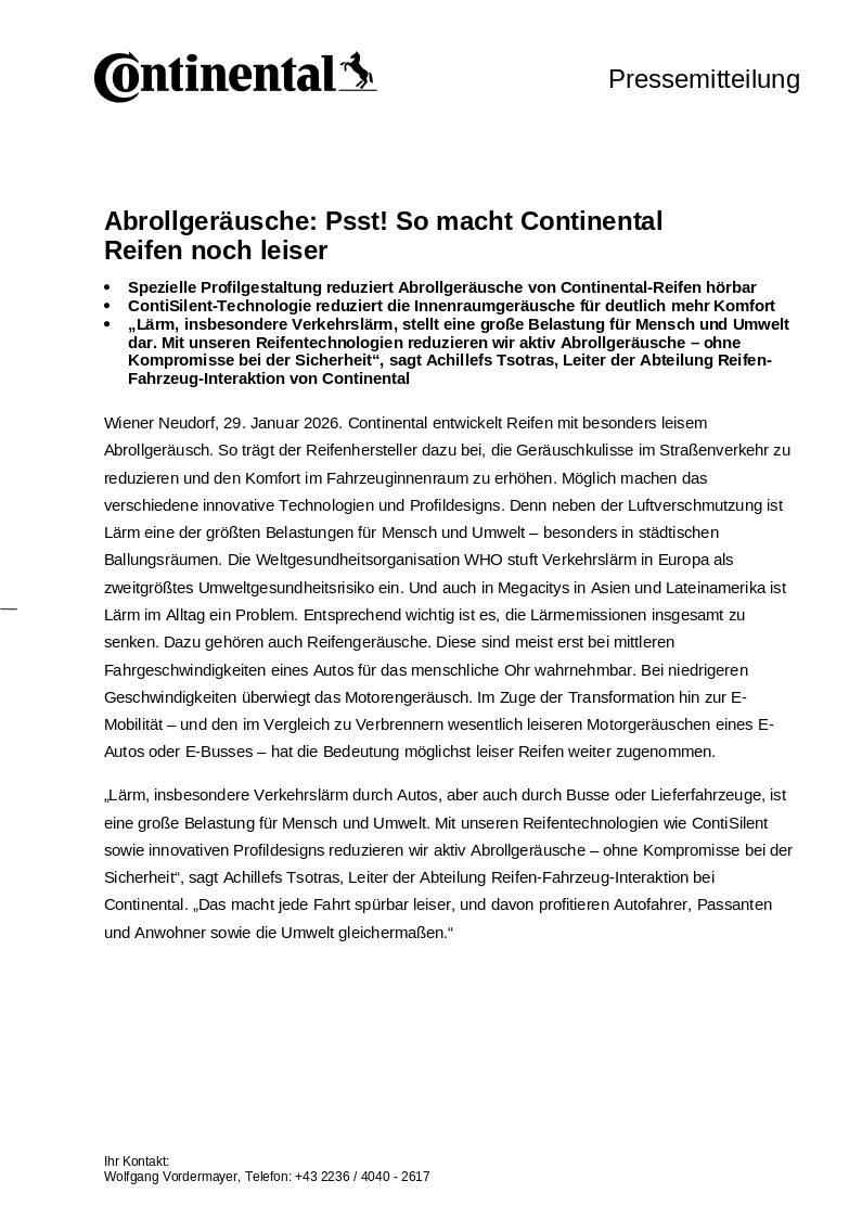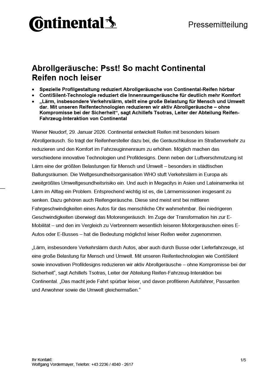 Dietikon, 29. Januar 2026. Continental entwickelt Reifen mit besonders leisem Abrollgeräusch. So trägt der Reifenhersteller dazu bei, die Geräuschkulisse im Strassenverkehr zu reduzieren und den Komfort im Fahrzeuginnenraum zu erhöhen. Möglich machen das verschiedene innovative Technologien und Profildesigns. Denn neben der Luftverschmutzung ist Lärm eine der grössten Belastungen für Mensch und Umwelt – besonders in städtischen Ballungsräumen. Die Weltgesundheitsorganisation WHO stuft Verkehrslärm in Europa als zweitgrösstes Umweltgesundheitsrisiko ein. Und auch in Megacitys in Asien und Lateinamerika ist Lärm im Alltag ein Problem. Entsprechend wichtig ist es, die Lärmemissionen insgesamt zu senken. Dazu gehören auch Reifengeräusche. Diese sind meist erst bei mittleren Fahrgeschwindigkeiten eines Autos für das menschliche Ohr wahrnehmbar. Bei niedrigeren Geschwindigkeiten überwiegt das Motorengeräusch. Im Zuge der Transformation hin zur E-Mobilität – und den im Vergleich zu Verbrennern wesentlich leiseren Motorgeräuschen eines E-Autos oder E-Busses – hat die Bedeutung möglichst leiser Reifen weiter zugenommen.