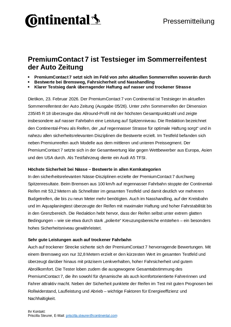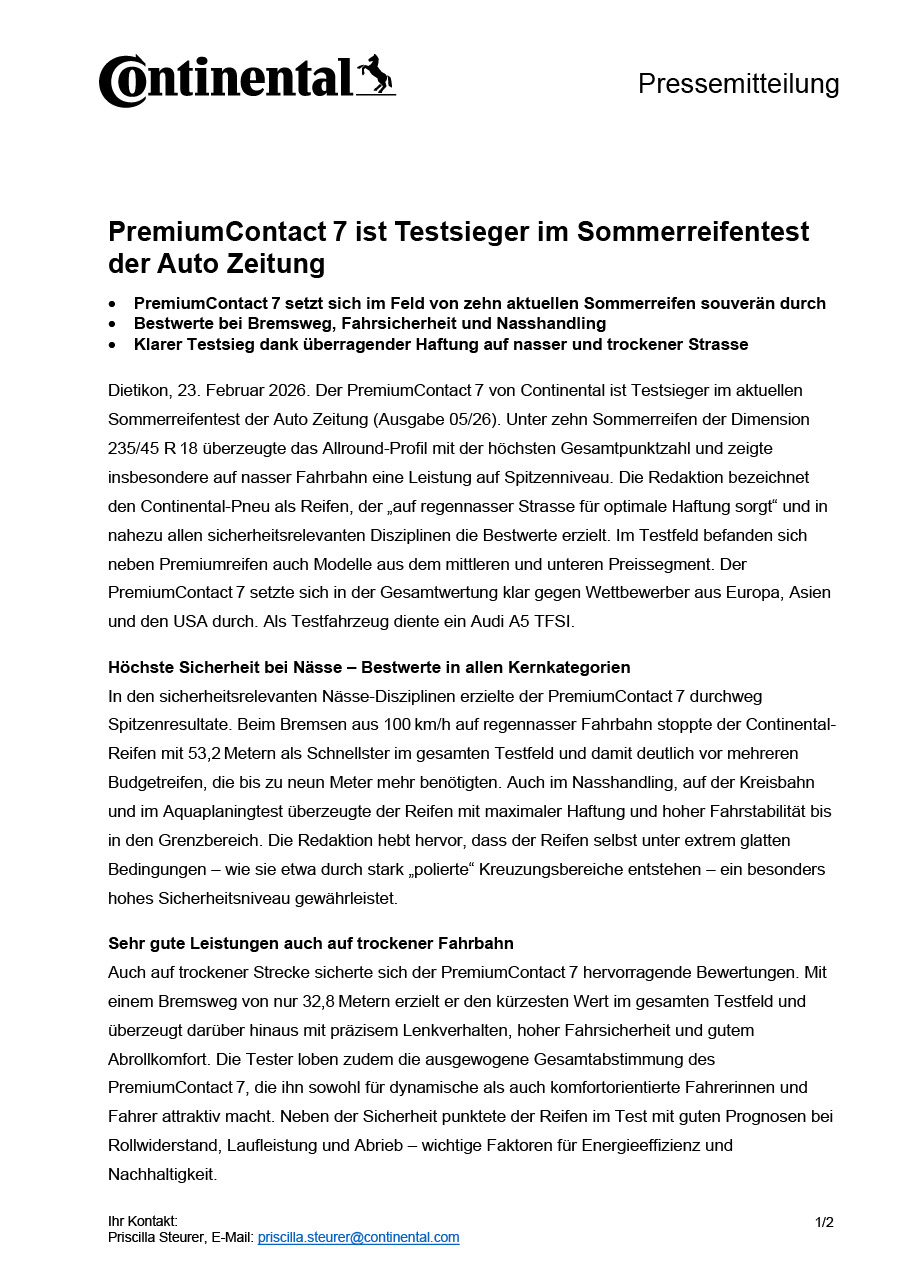 Dietikon, 23. Februar 2026. Der PremiumContact 7 von Continental ist Testsieger im aktuellen Sommerreifentest der Auto Zeitung (Ausgabe 05/26). Unter zehn Sommerreifen der Dimension 235/45 R 18 überzeugte das Allround-Profil mit der höchsten Gesamtpunktzahl und zeigte insbesondere auf nasser Fahrbahn eine Leistung auf Spitzenniveau. Die Redaktion bezeichnet den Continental-Pneu als Reifen, der „auf regennasser Strasse für optimale Haftung sorgt“ und in nahezu allen sicherheitsrelevanten Disziplinen die Bestwerte erzielt. Im Testfeld befanden sich neben Premiumreifen auch Modelle aus dem mittleren und unteren Preissegment. Der PremiumContact 7 setzte sich in der Gesamtwertung klar gegen Wettbewerber aus Europa, Asien und den USA durch. Als Testfahrzeug diente ein Audi A5 TFSI.