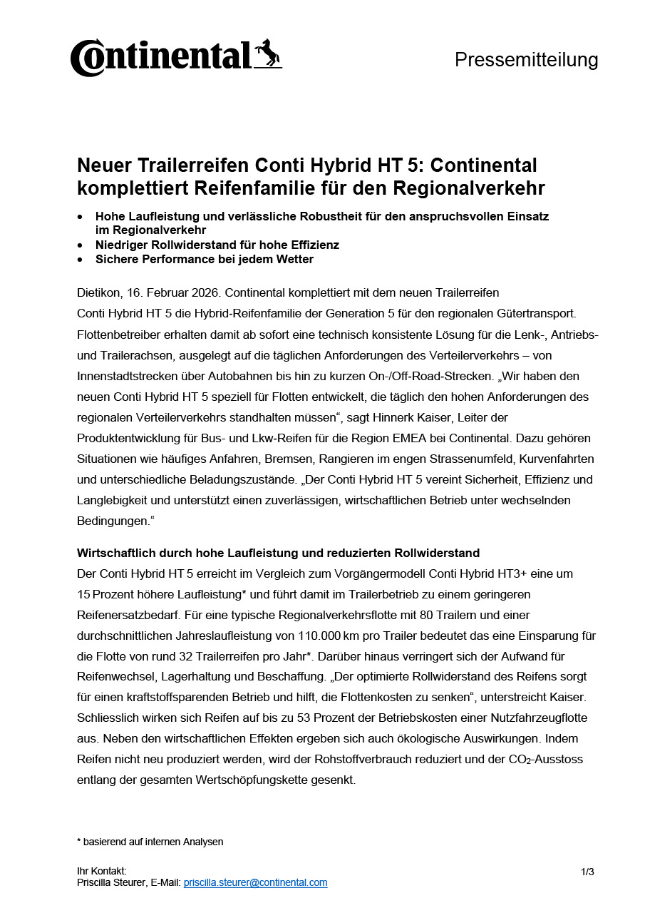 Dietikon, 16. Februar 2026. Continental komplettiert mit dem neuen Trailerreifen Conti Hybrid HT 5 die Hybrid‑Reifenfamilie der Generation 5 für den regionalen Gütertransport. Flottenbetreiber erhalten damit ab sofort eine technisch konsistente Lösung für die Lenk-, Antriebs- und Trailerachsen, ausgelegt auf die täglichen Anforderungen des Verteilerverkehrs – von Innenstadtstrecken über Autobahnen bis hin zu kurzen On-/Off‑Road‑Strecken. „Wir haben den neuen Conti Hybrid HT 5 speziell für Flotten entwickelt, die täglich den hohen Anforderungen des regionalen Verteilerverkehrs standhalten müssen“, sagt Hinnerk Kaiser, Leiter der Produktentwicklung für Bus- und Lkw‑Reifen für die Region EMEA bei Continental. Dazu gehören Situationen wie häufiges Anfahren, Bremsen, Rangieren im engen Strassenumfeld, Kurvenfahrten und unterschiedliche Beladungszustände. „Der Conti Hybrid HT 5 vereint Sicherheit, Effizienz und Langlebigkeit und unterstützt einen zuverlässigen, wirtschaftlichen Betrieb unter wechselnden Bedingungen.“