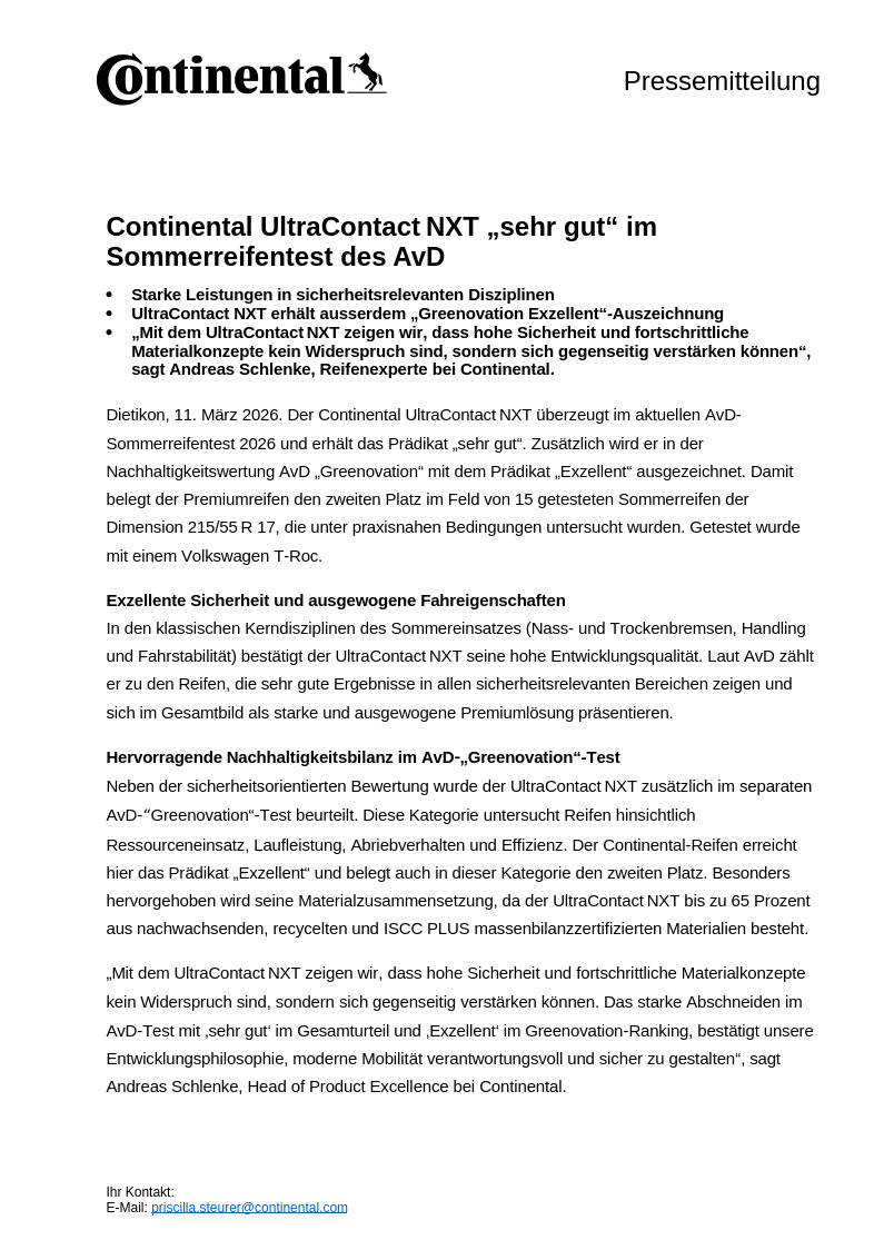 „Mit dem UltraContact NXT zeigen wir, dass hohe Sicherheit und fortschrittliche Materialkonzepte kein Widerspruch sind, sondern sich gegenseitig verstärken können. Das starke Abschneiden im AvD‑Test mit ‚sehr gut‘ im Gesamturteil und ‚Exzellent‘ im Greenovation‑Ranking, bestätigt unsere Entwicklungsphilosophie, moderne Mobilität verantwortungsvoll und sicher zu gestalten“, sagt Andreas Schlenke, Head of Product Excellence bei Continental.