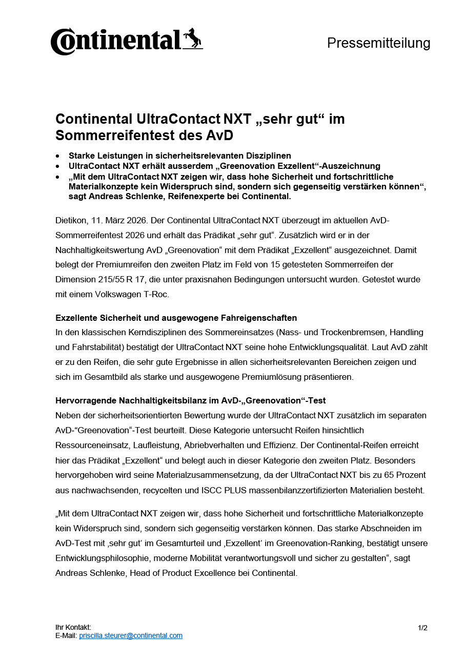 Dietikon, 11. März 2026. Der Continental UltraContact NXT überzeugt im aktuellen AvD-Sommerreifentest 2026 und erhält das Prädikat „sehr gut“. Zusätzlich wird er in der Nachhaltigkeitswertung AvD „Greenovation“ mit dem Prädikat „Exzellent“ ausgezeichnet. Damit belegt der Premiumreifen den zweiten Platz im Feld von 15 getesteten Sommerreifen der Dimension 215/55 R 17, die unter praxisnahen Bedingungen untersucht wurden. Getestet wurde mit einem Volkswagen T-Roc.