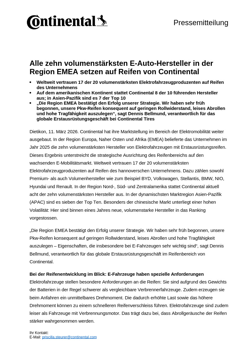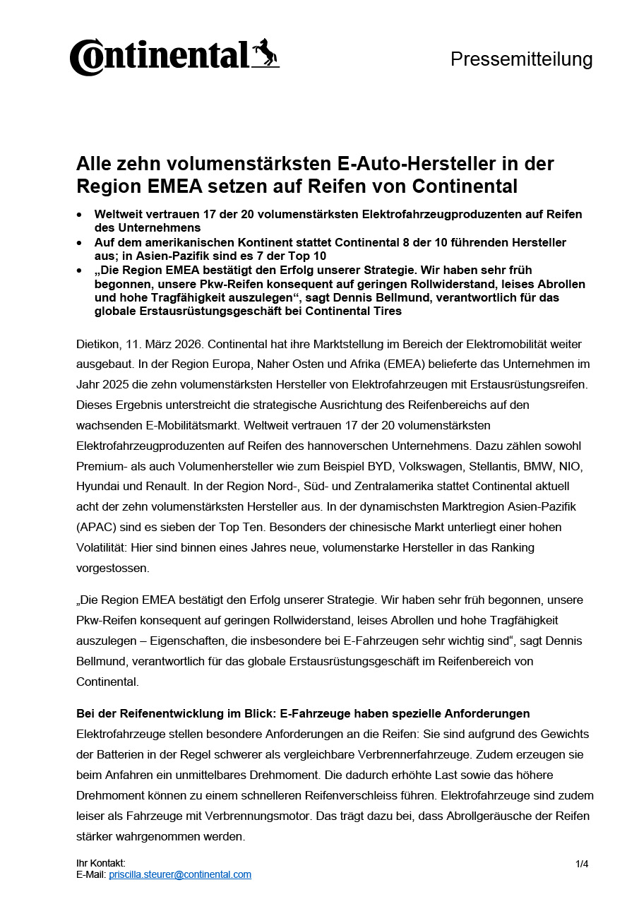 Dietikon, 11. März 2026. Continental hat ihre Marktstellung im Bereich der Elektromobilität weiter ausgebaut. In der Region Europa, Naher Osten und Afrika (EMEA) belieferte das Unternehmen im Jahr 2025 die zehn volumenstärksten Hersteller von Elektrofahrzeugen mit Erstausrüstungsreifen. Dieses Ergebnis unterstreicht die strategische Ausrichtung des Reifenbereichs auf den wachsenden E-Mobilitätsmarkt. Weltweit vertrauen 17 der 20 volumenstärksten Elektrofahrzeugproduzenten auf Reifen des hannoverschen Unternehmens. Dazu zählen sowohl Premium- als auch Volumenhersteller wie zum Beispiel BYD, Volkswagen, Stellantis, BMW, NIO, Hyundai und Renault. In der Region Nord-, Süd- und Zentralamerika stattet Continental aktuell acht der zehn volumenstärksten Hersteller aus. In der dynamischsten Marktregion Asien-Pazifik (APAC) sind es sieben der Top Ten. Besonders der chinesische Markt unterliegt einer hohen Volatilität: Hier sind binnen eines Jahres neue, volumenstarke Hersteller in das Ranking vorgestossen.