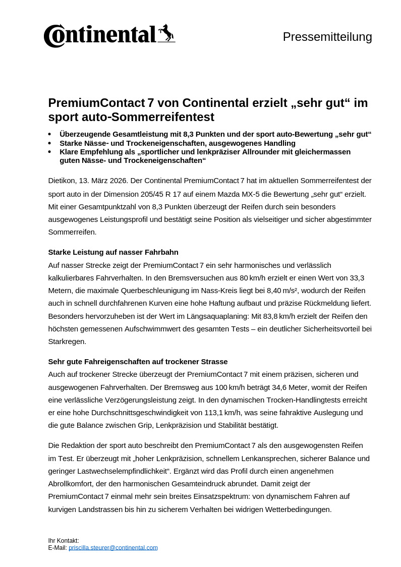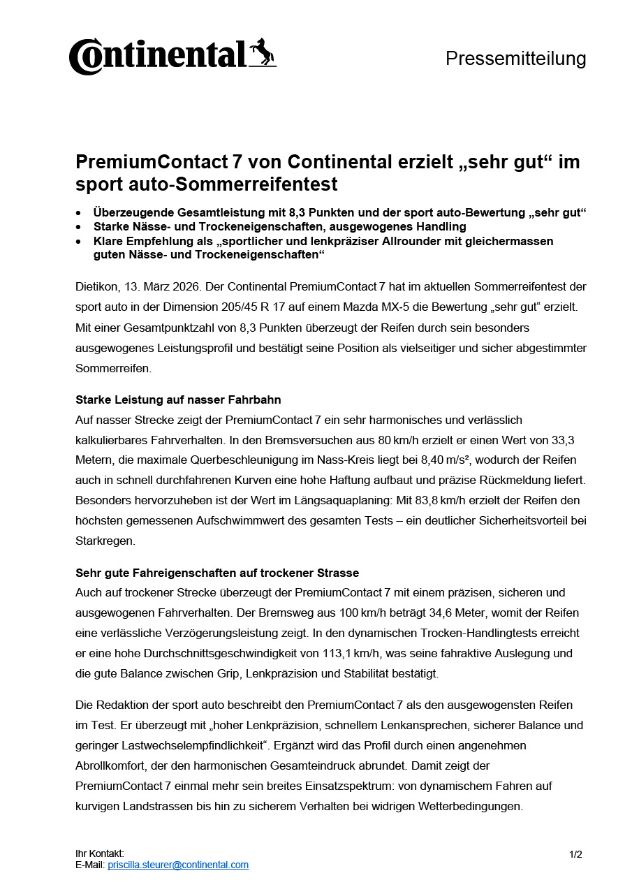 Dietikon, 13. März 2026. Der Continental PremiumContact 7 hat im aktuellen Sommerreifentest der sport auto in der Dimension 205/45 R 17 auf einem Mazda MX‑5 die Bewertung „sehr gut“ erzielt. Mit einer Gesamtpunktzahl von 8,3 Punkten überzeugt der Reifen durch sein besonders ausgewogenes Leistungsprofil und bestätigt seine Position als vielseitiger und sicher abgestimmter Sommerreifen.