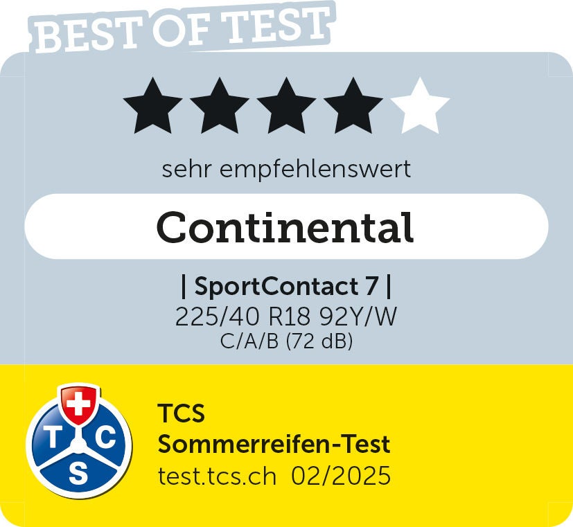 Im Sommerrreifentest 2025 des TCS wurde der SportContact 7 in der Dimension 225/40 R18 92Y/W getestet und als Testsieger auf Platz 1 mit der Gesamtnote „sehr empfehlenswert“ bewertet. Gestestet wurde auf einem VW Golf.