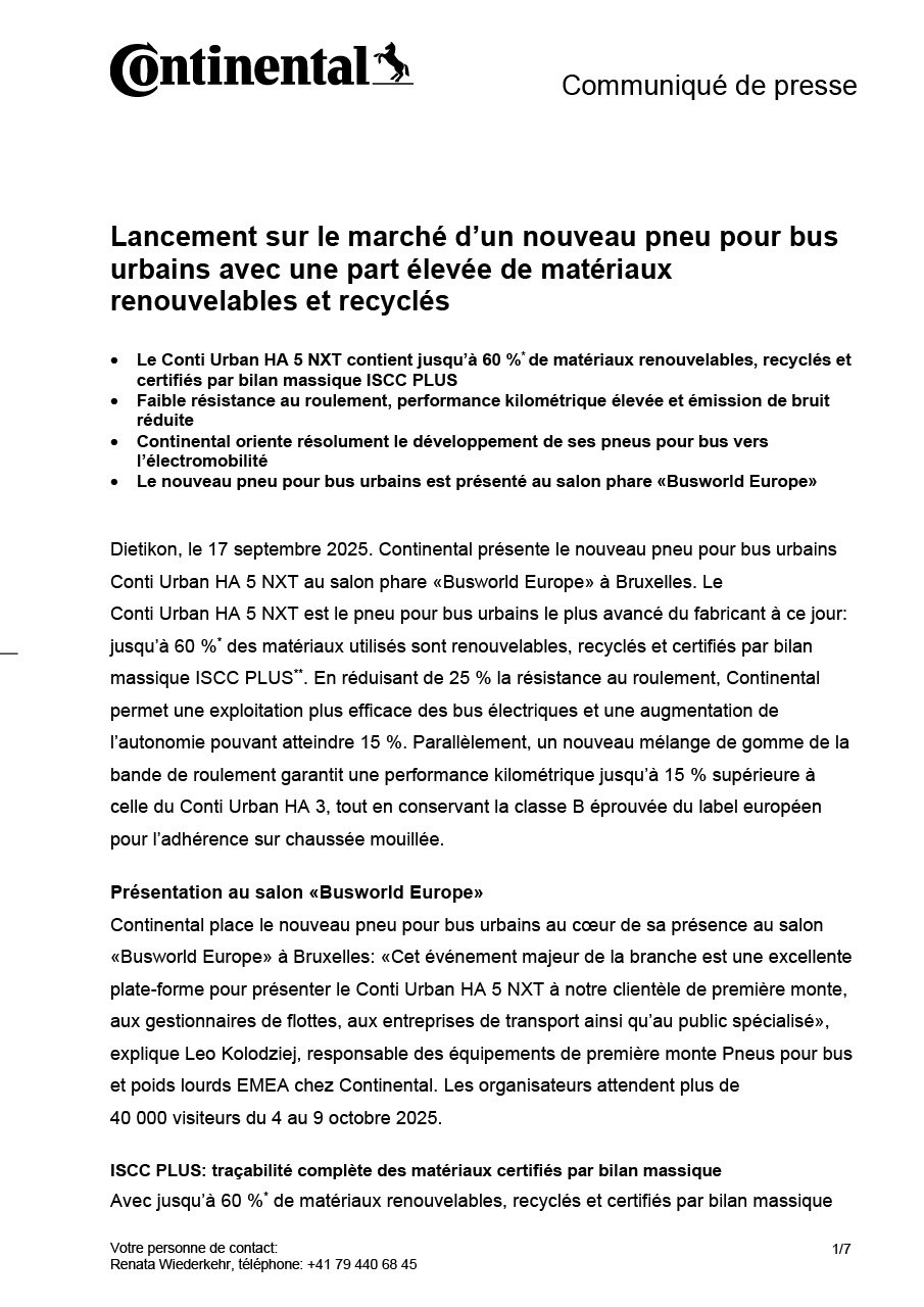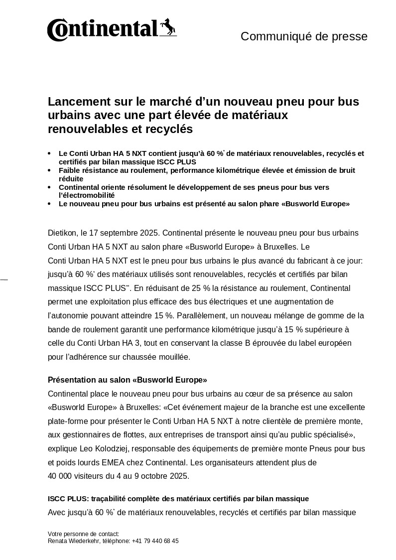 Dietikon, le 17 septembre 2025. Continental présente le nouveau pneu pour bus urbains Conti Urban HA 5 NXT au salon phare «Busworld Europe» à Bruxelles. Le Conti Urban HA 5 NXT est le pneu pour bus urbains le plus avancé du fabricant à ce jour: jusqu’à 60 %* des matériaux utilisés sont renouvelables, recyclés et certifiés par bilan massique ISCC PLUS**. En réduisant de 25 % la résistance au roulement, Continental permet une exploitation plus efficace des bus électriques et une augmentation de l’autonomie pouvant atteindre 15 %. Parallèlement, un nouveau mélange de gomme de la bande de roulement garantit une performance kilométrique jusqu’à 15 % supérieure à celle du Conti Urban HA 3, tout en conservant la classe B éprouvée du label européen pour l’adhérence sur chaussée mouillée.
