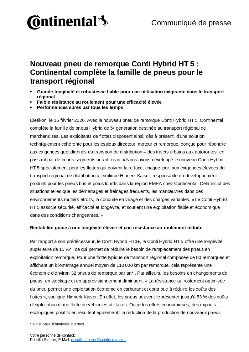 Dietikon, 16 février 2026. Avec le nouveau pneu de remorque Conti Hybrid HT 5, Continental complète la famille de pneus Hybrid de 5ᵉ génération destinée au transport régional de marchandises. Les exploitants de flottes disposent ainsi, dès à présent, d’une solution techniquement cohérente pour les essieux directeur, moteur et remorque, conçue pour répondre aux exigences quotidiennes du transport de distribution – des trajets urbains aux autoroutes, en passant par de courts segments on-/off-road. « Nous avons développé le nouveau Conti Hybrid HT 5 spécialement pour les flottes qui doivent faire face, chaque jour, aux exigences élevées du transport régional de distribution », explique Hinnerk Kaiser, responsable du développement produits pour les pneus bus et poids lourds dans la région EMEA chez Continental. Cela inclut des situations telles que les démarrages et freinages fréquents, les manœuvres dans des environnements routiers étroits, la conduite en virage et des charges variables. « Le Conti Hybrid HT 5 associe sécurité, efficacité et longévité, et soutient une exploitation fiable et économique dans des conditions changeantes. »
