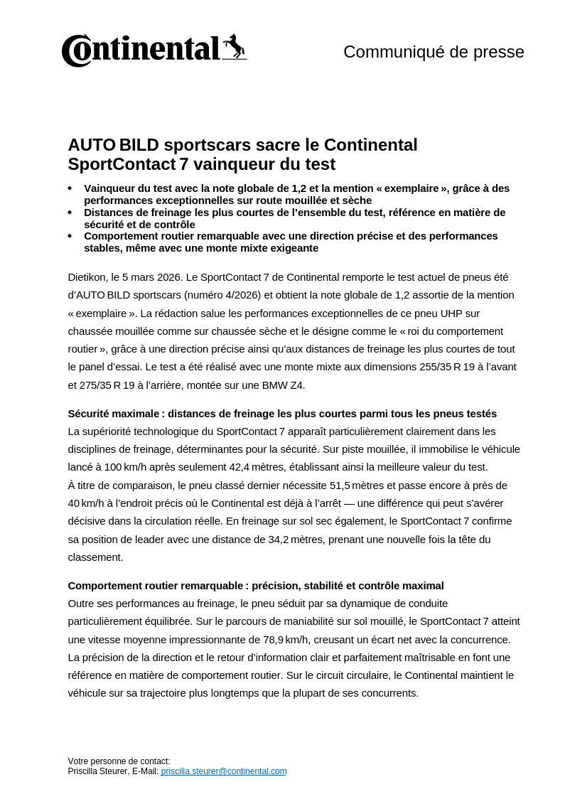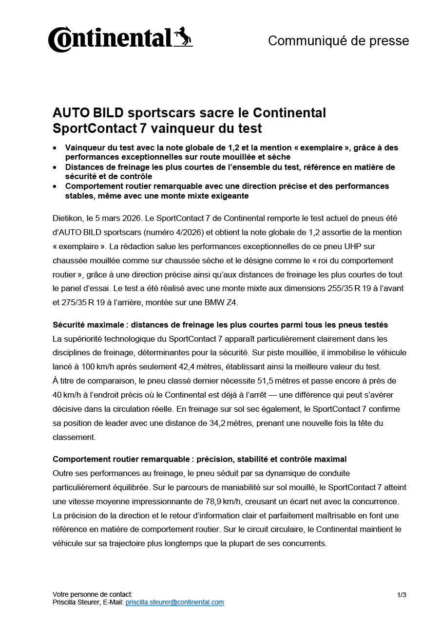 Dietikon, le 5 mars 2026. Le SportContact 7 de Continental remporte le test actuel de pneus été d’AUTO BILD sportscars (numéro 4/2026) et obtient la note globale de 1,2 assortie de la mention « exemplaire ». La rédaction salue les performances exceptionnelles de ce pneu UHP sur chaussée mouillée comme sur chaussée sèche et le désigne comme le « roi du comportement routier », grâce à une direction précise ainsi qu’aux distances de freinage les plus courtes de tout le panel d’essai. Le test a été réalisé avec une monte mixte aux dimensions 255/35 R 19 à l’avant et 275/35 R 19 à l’arrière, montée sur une BMW Z4.