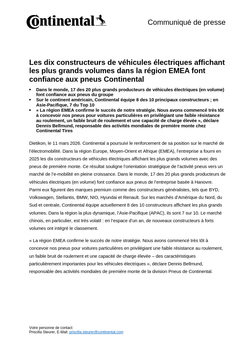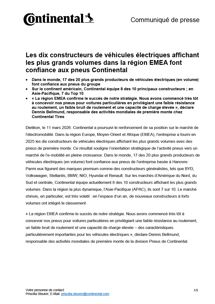 Dietikon, le 11 mars 2026. Continental a poursuivi le renforcement de sa position sur le marché de l’électromobilité. Dans la région Europe, Moyen-Orient et Afrique (EMEA), l’entreprise a fourni en 2025 les dix constructeurs de véhicules électriques affichant les plus grands volumes avec des pneus de première monte. Ce résultat souligne l’orientation stratégique de l’activité pneus vers un marché de l’e-mobilité en pleine croissance. Dans le monde, 17 des 20 plus grands producteurs de véhicules électriques (en volume) font confiance aux pneus de l’entreprise basée à Hanovre. Parmi eux figurent des marques premium comme des constructeurs généralistes, tels que BYD, Volkswagen, Stellantis, BMW, NIO, Hyundai et Renault. Sur les marchés d’Amérique du Nord, du Sud et centrale, Continental équipe actuellement 8 des 10 constructeurs affichant les plus grands volumes. Dans la région la plus dynamique, l’Asie-Pacifique (APAC), ils sont 7 sur 10. Le marché chinois, en particulier, est très volatil : en l’espace d’un an, de nouveaux constructeurs à forts volumes ont intégré le classement.