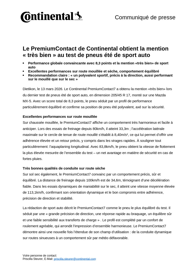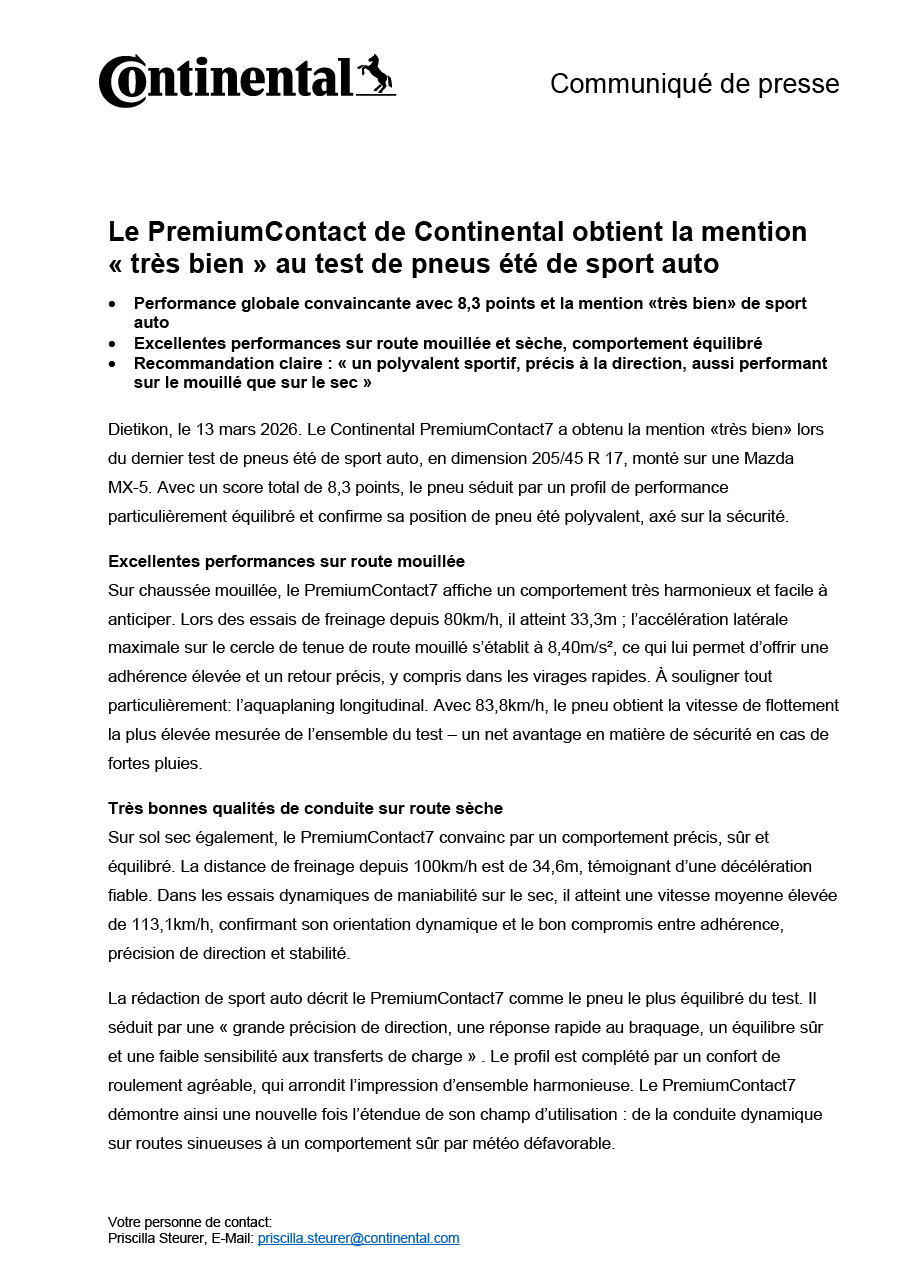 Dietikon, le 13 mars 2026. Le Continental PremiumContact7 a obtenu la mention «très bien» lors du dernier test de pneus été de sport auto, en dimension 205/45 R 17, monté sur une Mazda MX‑5. Avec un score total de 8,3 points, le pneu séduit par un profil de performance particulièrement équilibré et confirme sa position de pneu été polyvalent, axé sur la sécurité.