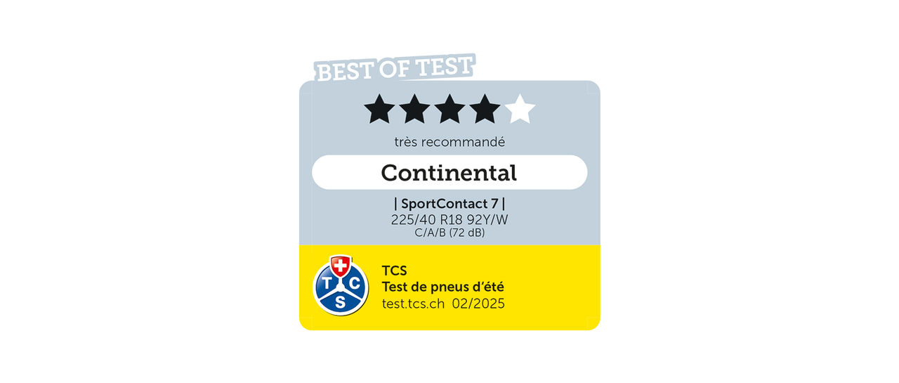 Le Continental SportContact 7 convainc depuis des années. Non seulement comme véritable haut‑performer sur la route, mais aussi dans de nombreux tests réalisés par des experts indépendants. Il est le champion en série des pneus haute performance, avec 13 victoires dans 15 tests depuis 2022*, dont trois victoires rien qu’en 2025.