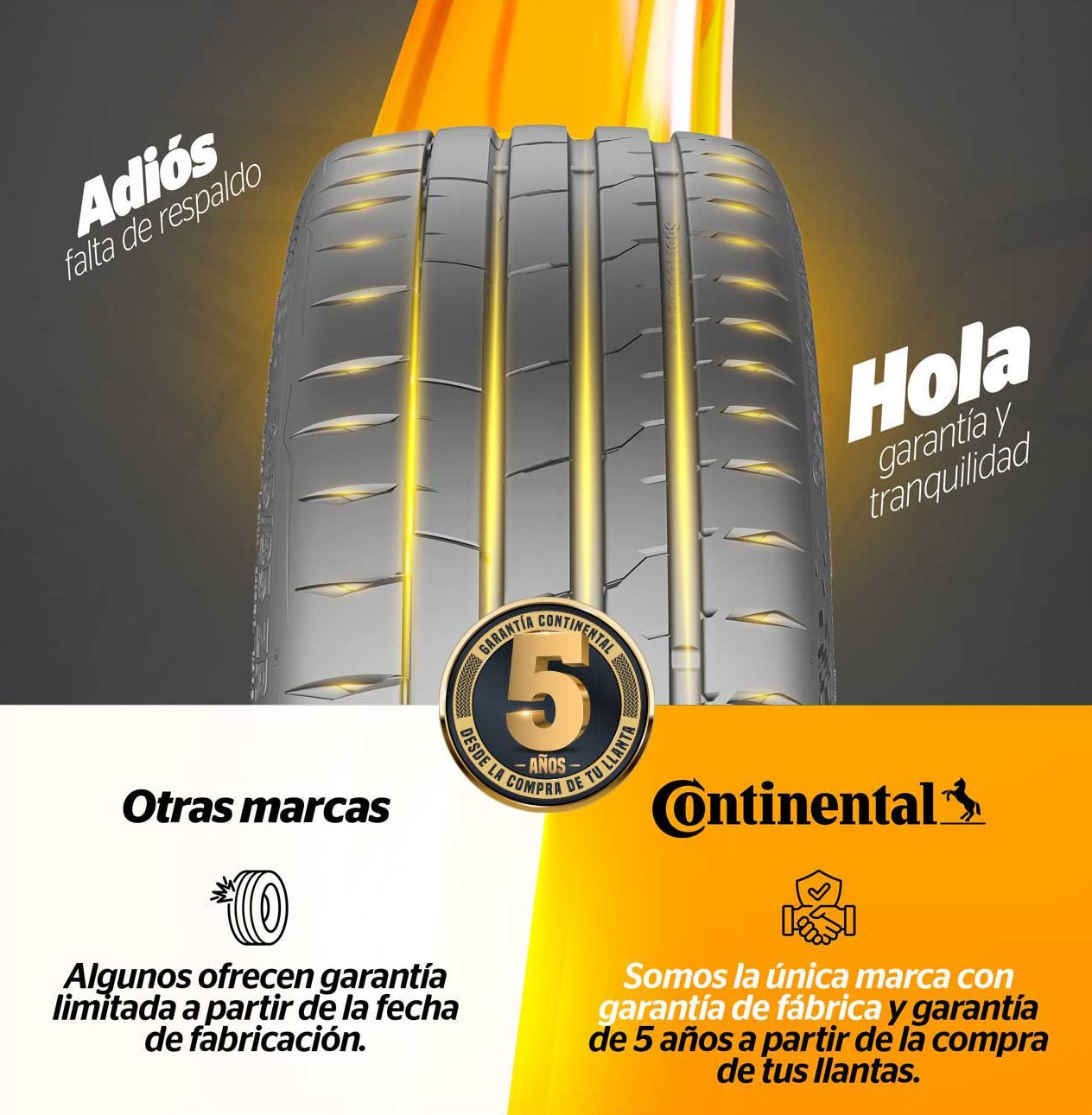 Todas nuestras llantas están en garantía, Continental South America garantiza sus productos por un plazo de cinco años, contados desde la fecha de adquisición, comprobada a través de la factura de compra de las llantas o del vehículo nuevo (llantas instaladas como equipo original); contra cualquier falla y/o defecto de fabricación que sea constatado y que impida o limite su uso antes del término referido.