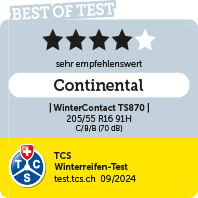 Im aktuellen Winterreifentest des TCS wurde unser WinterContact TS 870 in der Dimension 205/55 R16 91H getestet und erreichte den 1. Platz mit der Bestnote "Sehr empfehlenswert". Getestet wurde auf einem VW Golf 8.