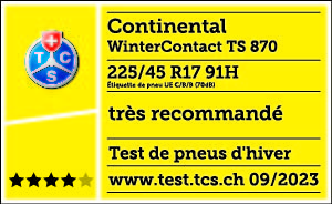 Dans le test des pneus d'hiver actuel du TCS, notre WinterContact TS 870 a été testé dans la dimension 225/45 R17 91H et a obtenu la 1ère place avec la meilleure note "très recommandé". Éété testé sur une VW Golf.
