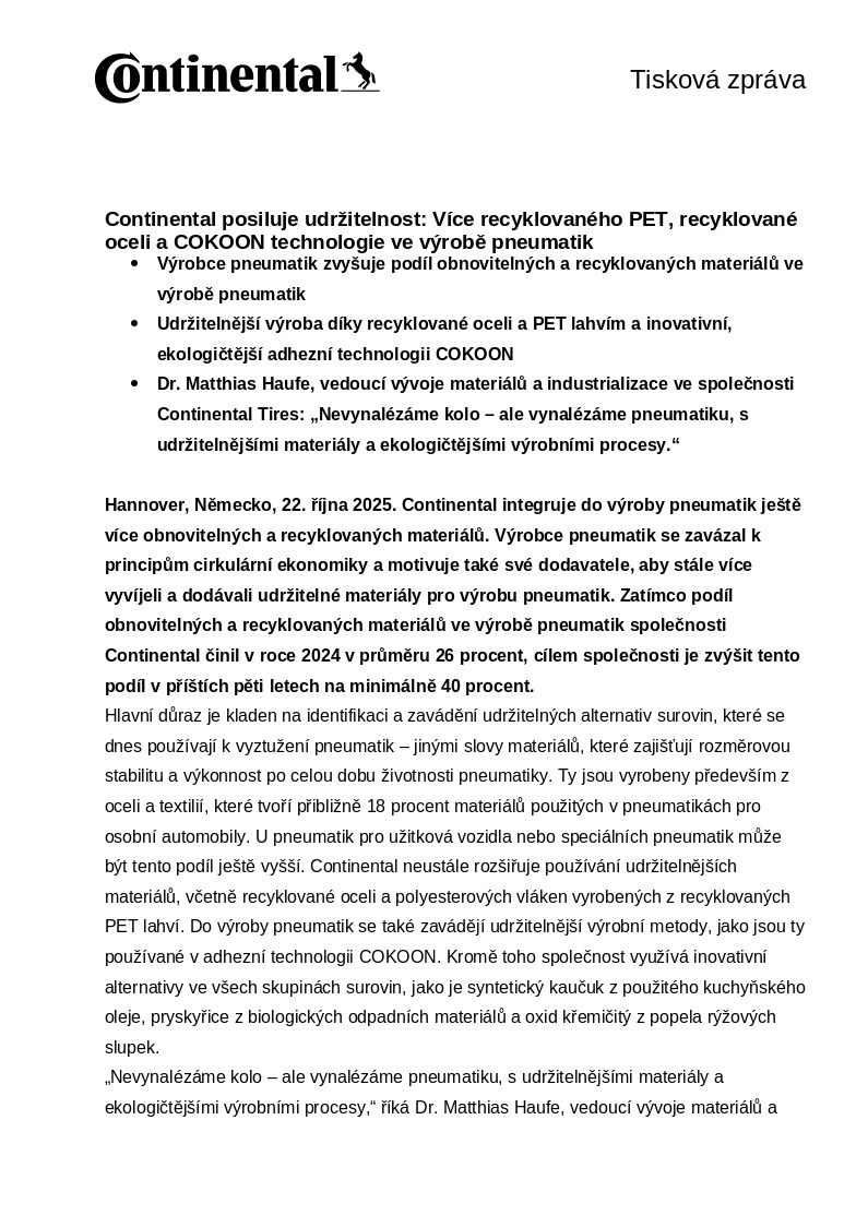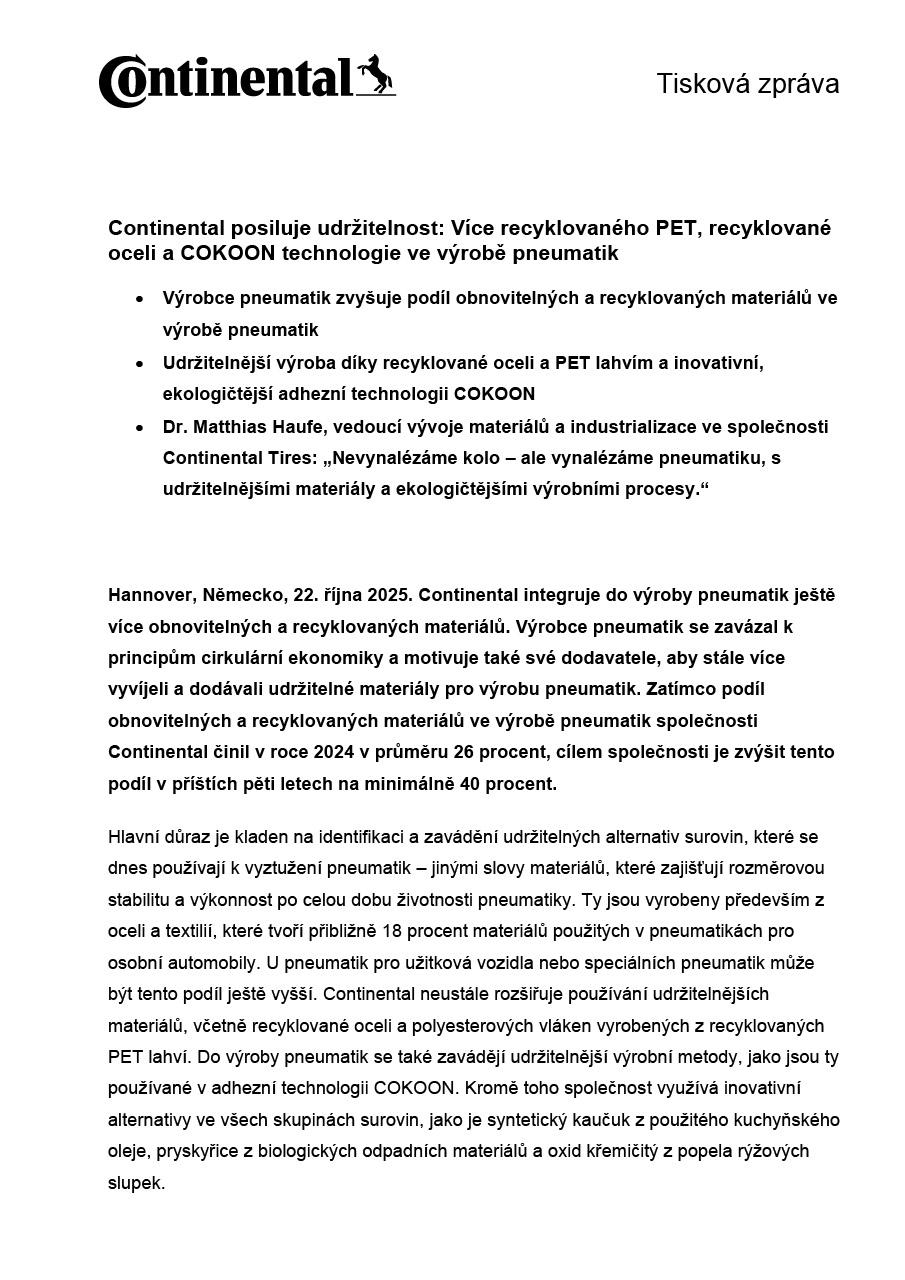 „Nevynalézáme kolo – ale vynalézáme pneumatiku, s udržitelnějšími materiály a ekologičtějšími výrobními procesy,“ říká Dr. Matthias Haufe, vedoucí vývoje materiálů a industrializace ve společnosti Continental Tires. „Nejde jen o samotný kaučuk. Zaměřujeme se také na materiály, které pneumatice dodávají tvar a činí pneumatiky stabilními a bezpečnými. Recyklovaná ocel a polyesterová příze vyrobená z recyklovaných PET lahví jsou důležité pro udržitelnější výrobu pneumatik. Naším cílem je do pěti let používat v našich pneumatikách alespoň 40 procent obnovitelných a recyklovaných materiálů. Každý alternativní materiál nás přibližuje o důležitý krok k tomuto cíli.“