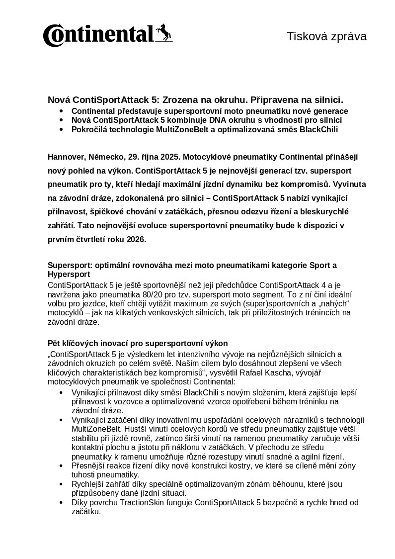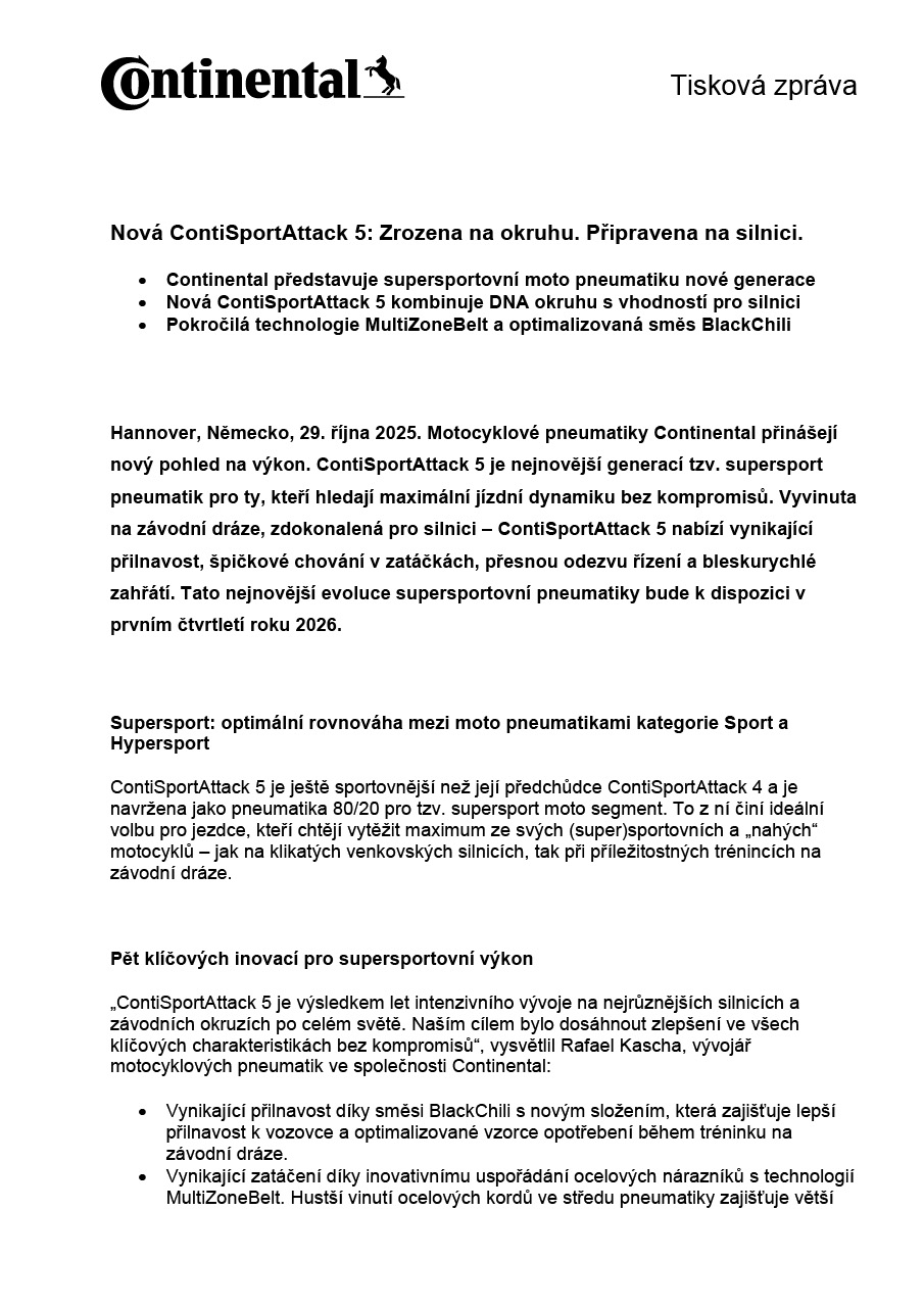 Hannover, Německo, 29. října 2025. Motocyklové pneumatiky Continental přinášejí nový pohled na výkon. ContiSportAttack 5 je nejnovější generací tzv. supersport pneumatik pro ty, kteří hledají maximální jízdní dynamiku bez kompromisů. Vyvinuta na závodní dráze, zdokonalená pro silnici – ContiSportAttack 5 nabízí vynikající přilnavost, špičkové chování v zatáčkách, přesnou odezvu řízení a bleskurychlé zahřátí. Tato nejnovější evoluce supersportovní pneumatiky bude k dispozici v prvním čtvrtletí roku 2026.