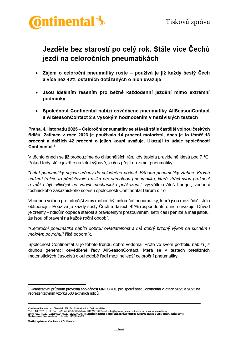 Praha, 4. listopadu 2025 – Celoroční pneumatiky se stávají stále častější volbou českých řidičů. Zatímco v roce 2023 je používalo 14 procent motoristů, dnes je to téměř 18 procent a dalších 42 procent o jejich koupi uvažuje. Ukazují to údaje společnosti Continental.[1]