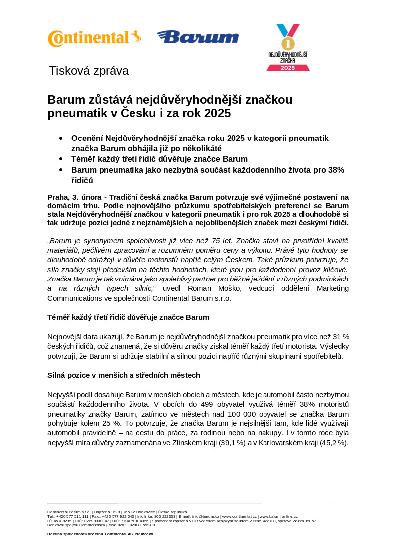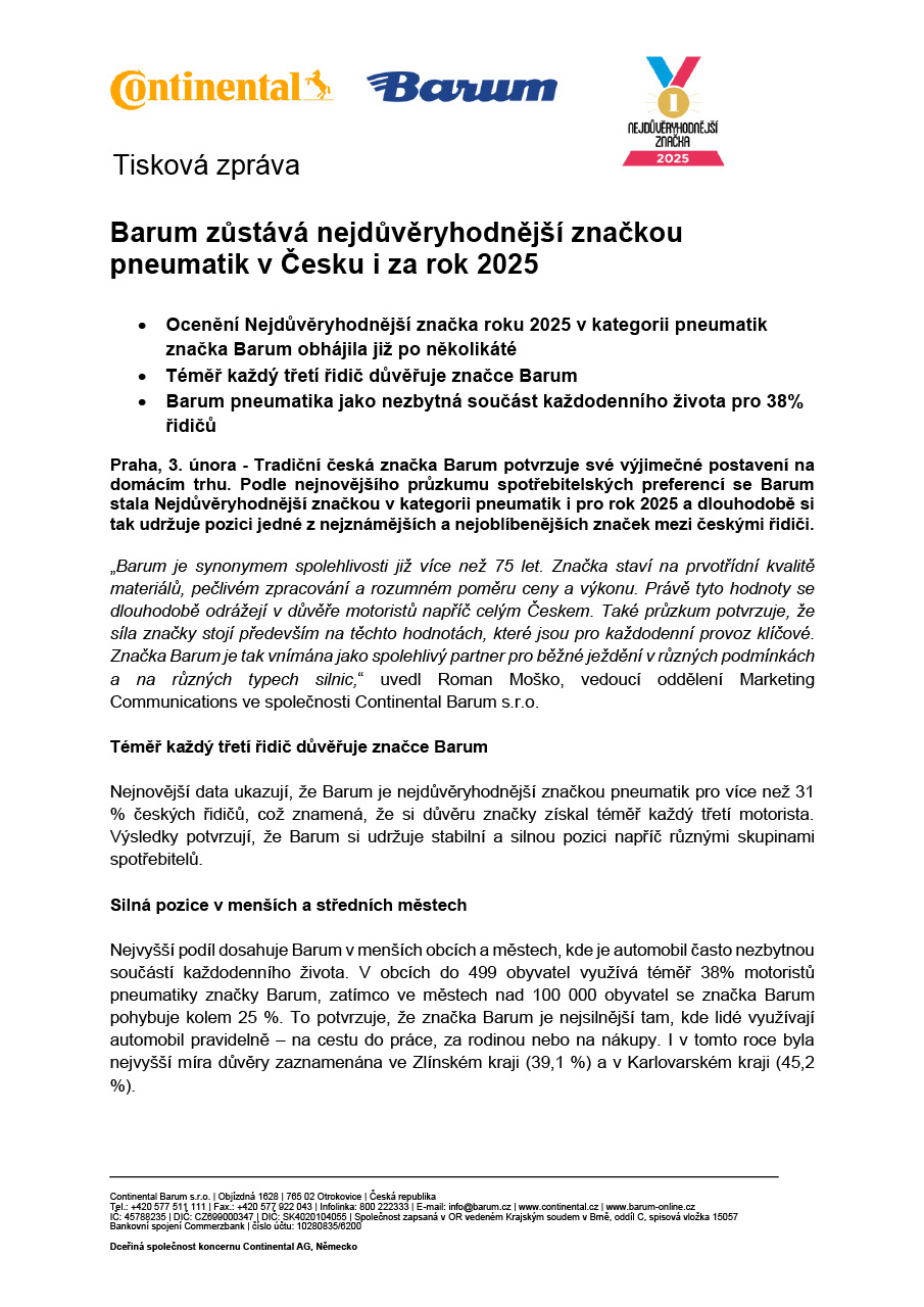 Praha, 3. února - Tradiční česká značka Barum potvrzuje své výjimečné postavení na domácím trhu. Podle nejnovějšího průzkumu spotřebitelských preferencí se Barum stala Nejdůvěryhodnější značkou v kategorii pneumatik i pro rok 2025 a dlouhodobě si tak udržuje pozici jedné z nejznámějších a nejoblíbenějších značek mezi českými řidiči.