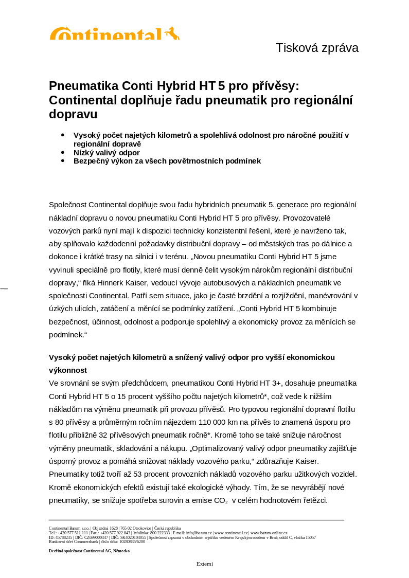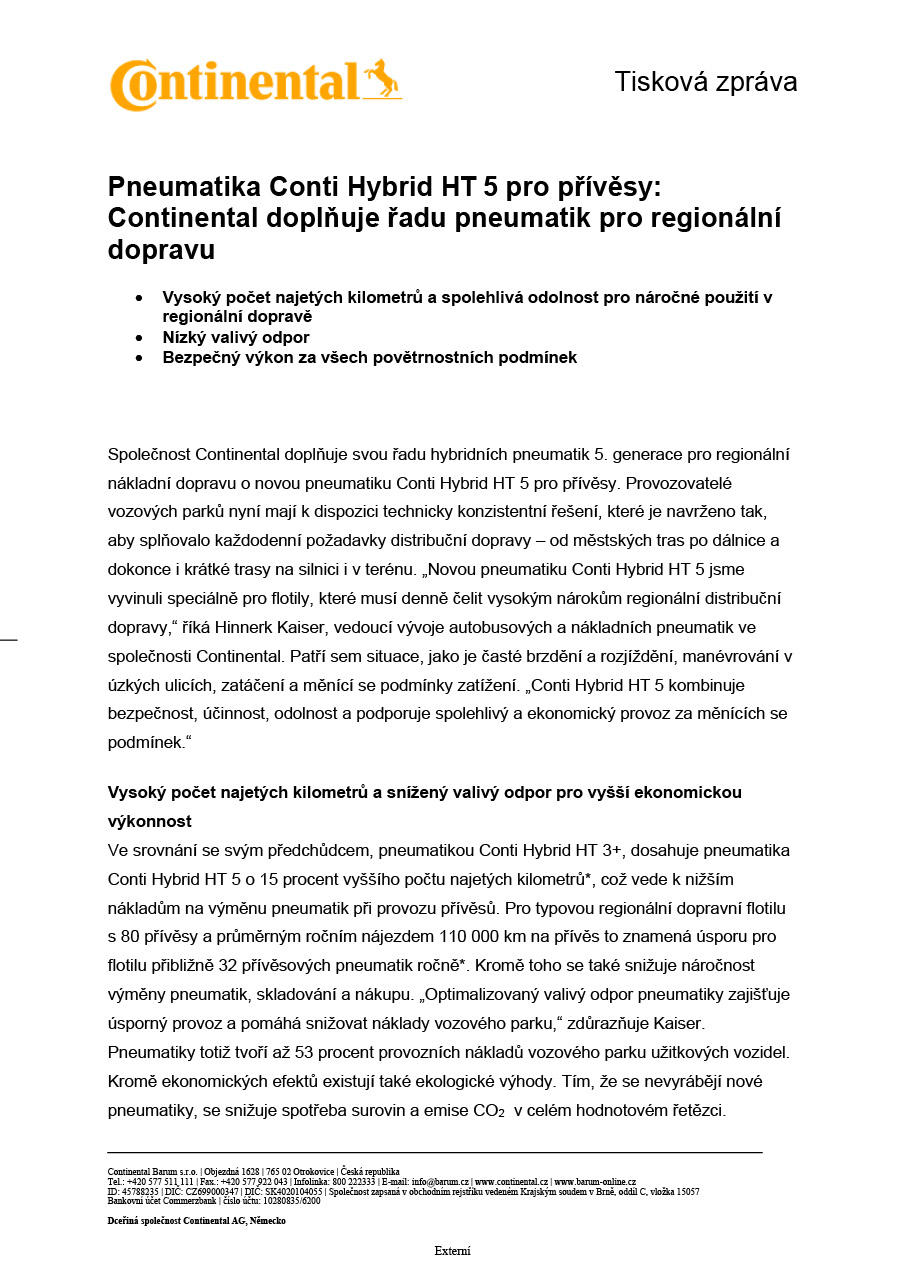 Společnost Continental doplňuje svou řadu hybridních pneumatik 5. generace pro regionální nákladní dopravu o novou pneumatiku Conti Hybrid HT 5 pro přívěsy. Provozovatelé vozových parků nyní mají k dispozici technicky konzistentní řešení, které je navrženo tak, aby splňovalo každodenní požadavky distribuční dopravy – od městských tras po dálnice a dokonce i krátké trasy na silnici i v terénu. „Novou pneumatiku Conti Hybrid HT 5 jsme vyvinuli speciálně pro flotily, které musí denně čelit vysokým nárokům regionální distribuční dopravy,“ říká Hinnerk Kaiser, vedoucí vývoje autobusových a nákladních pneumatik ve společnosti Continental. Patří sem situace, jako je časté brzdění a rozjíždění, manévrování v úzkých ulicích, zatáčení a měnící se podmínky zatížení. „Conti Hybrid HT 5 kombinuje bezpečnost, účinnost, odolnost a podporuje spolehlivý a ekonomický provoz za měnících se podmínek.“