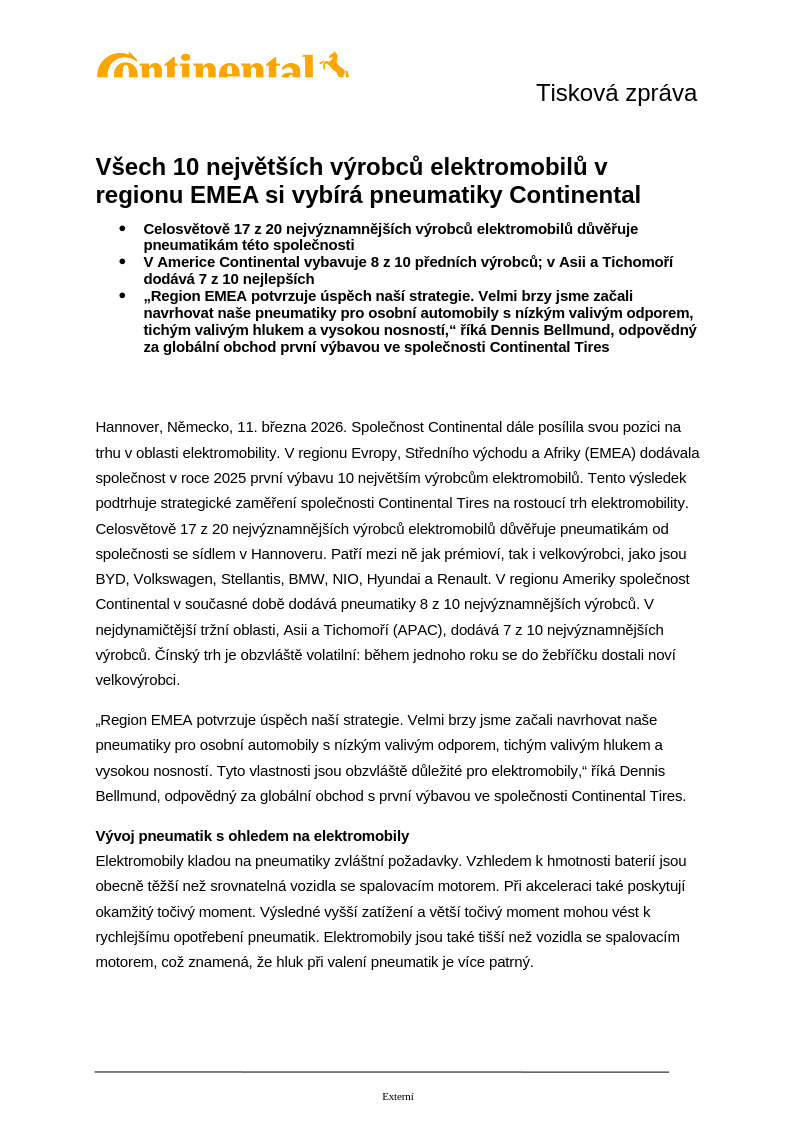 „Region EMEA potvrzuje úspěch naší strategie. Velmi brzy jsme začali navrhovat naše pneumatiky pro osobní automobily s nízkým valivým odporem, tichým valivým hlukem a vysokou nosností. Tyto vlastnosti jsou obzvláště důležité pro elektromobily,“ říká Dennis Bellmund, odpovědný za globální obchod s první výbavou ve společnosti Continental Tires.