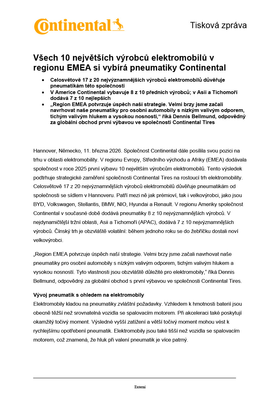Hannover, Německo, 11. března 2026. Společnost Continental dále posílila svou pozici na trhu v oblasti elektromobility. V regionu Evropy, Středního východu a Afriky (EMEA) dodávala společnost v roce 2025 pneu pro první výbavu 10 největším výrobcům elektromobilů. Tento výsledek podtrhuje strategické zaměření společnosti Continental Tires na rostoucí trh elektromobility. Celosvětově 17 z 20 nejvýznamnějších výrobců elektromobilů důvěřuje pneumatikám od společnosti Continental se sídlem v Hannoveru. Patří mezi ně jak prémioví, tak i velkovýrobci, jako jsou BYD, Volkswagen, Stellantis, BMW, NIO, Hyundai a Renault. V regionu Ameriky společnost Continental v současné době dodává pneumatiky 8 z 10 nejvýznamnějších výrobců. V nejdynamičtější tržní oblasti, Asii a Tichomoří (APAC), dodává 7 z 10 nejvýznamnějších výrobců. Čínský trh je obzvláště volatilní: během jednoho roku se do žebříčku dostali noví velkovýrobci.