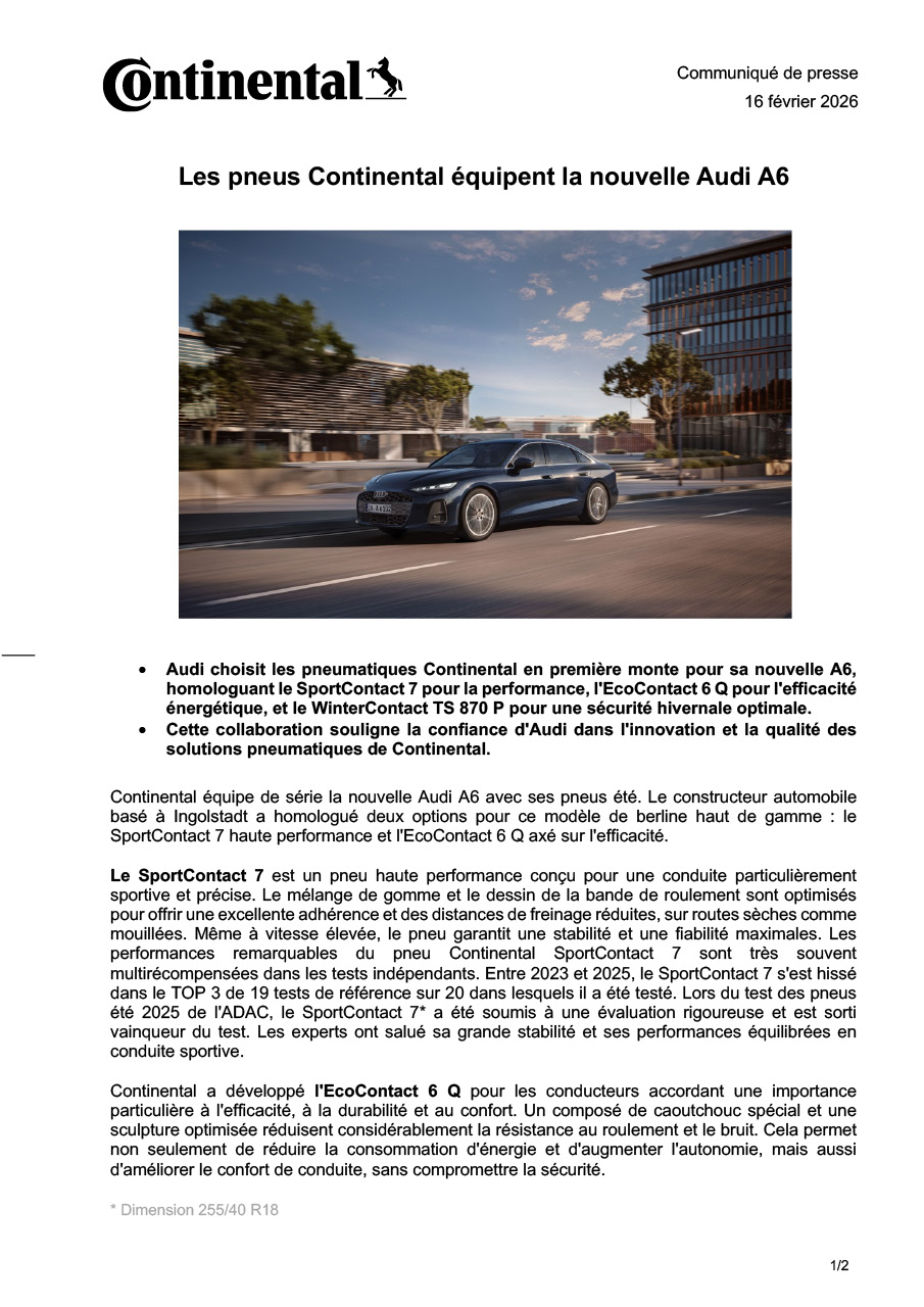 - Audi choisit les pneumatiques Continental en première monte pour sa nouvelle A6,homologuant le SportContact 7 pour la performance, l'EcoContact 6 Q pour l'efficacité énergétique, et le WinterContact TS 870 P pour une sécurité hivernale optimale.