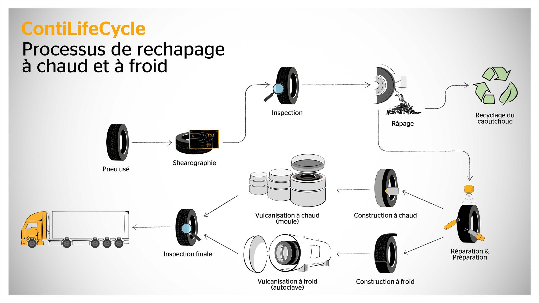 Le ContiLifeCycle est un système global créé pour offrir la tranquillité d’esprit aux clients en réutilisant les pneus et en prolongeant leur durée de vie.