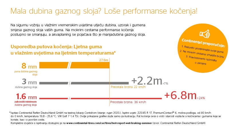 Nakon tog trenutka rizik od hidroplaninga dramatično se povećava. Osim toga, smanjeni gazni sloj također utječe na performansi kočenja. Što je gazni sloj na gumama automobila više istrošen, to je dulje potrebno da se potpuno zaustavi, kao što pokazuju rezultati testiranja.