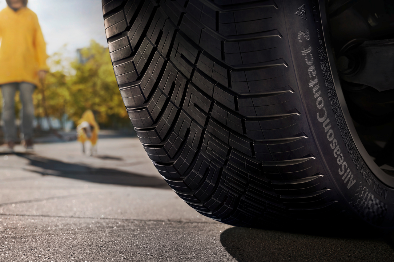AllSeasonContact 2の新旧比較図(右欄)。「転がり抵抗性能」「ウェット性能」の性能向上ポイントが示されている。