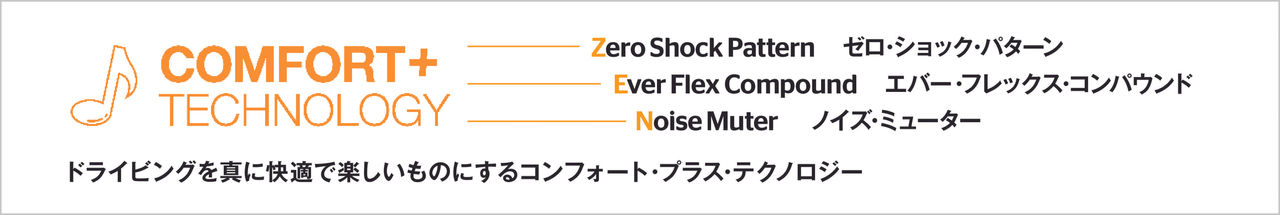 連続したリブ構造とサイピングが特徴のゼロ・ショック・パターン・デザインが衝撃を軽減。凹凸が多い路面でもスムーズな乗り心地を実現します。