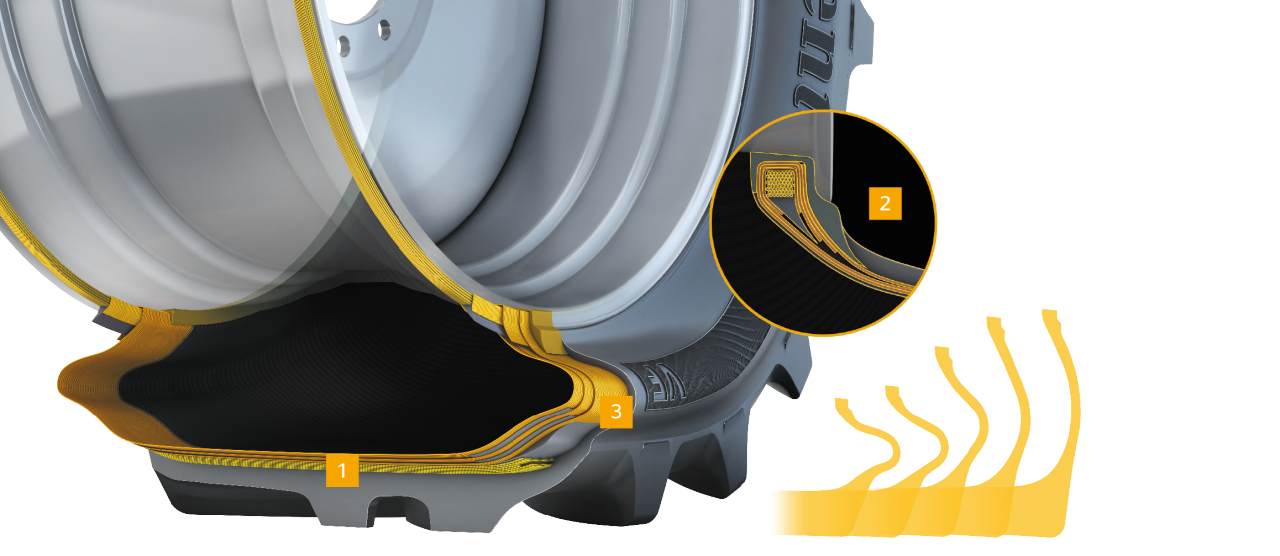 - Short medium-rubber apex for greater bead endurance and high deflection performance of the sidewall