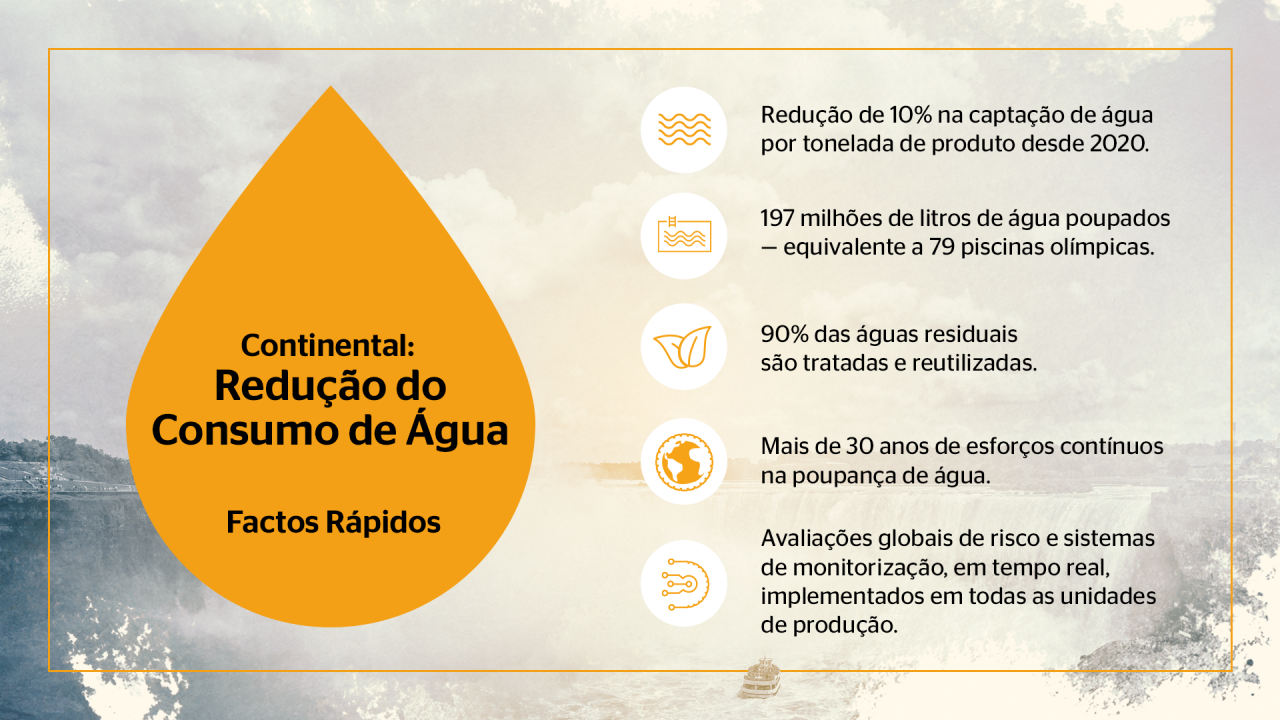 Na Continental, a sustentabilidade não é apenas um compromisso — é um sistema. Através de uma combinação de tecnologias avançadas e planeamento inteligente de recursos, a empresa reduziu significativamente o seu consumo de água.
